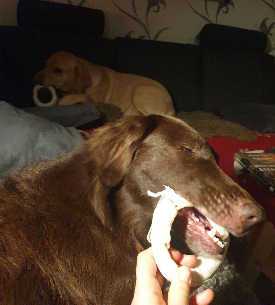 Jag kom att tänka på henne (och hur Sid servar henne med färdigtuggad mat i någon av filmerna) när jag som vanligt gav Femmas ben till Delfi och sa åt Femma att hämta det andra, otuggade benet i köket. Med ålderns rätt vill nämligen Delfi att någon, dvs Femma, mjukar upp kanterna på hudbenet lite innan hon börjar tugga. Så även om båda självklart får varsitt ben, avvaktar Delfi tills Femma tuggat lite på sitt ben – sedan görs ovan nämnda byte, och därefter kan båda tugga på varsitt ben och båda är nöjda. Femma har fått ett sprillans nytt ben och Delfi ett med mjuka kanter.