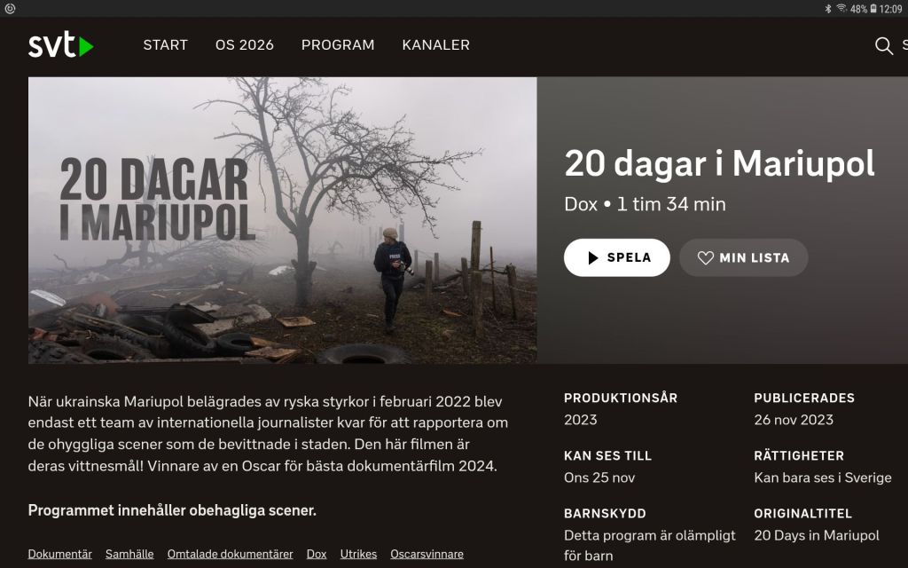 Finns att se på Svtplay. Se den! Se vad ryssarna utsätter ukrainarna för. Nu, idag, i andra städer i Ukraina. Med den nuvarande amerikanska presidentens goda minne – för han har inte en endaste gång sagt att ryssarna måste avbryta sitt invasionskrig mot Ukraina så att kriget tar slut.