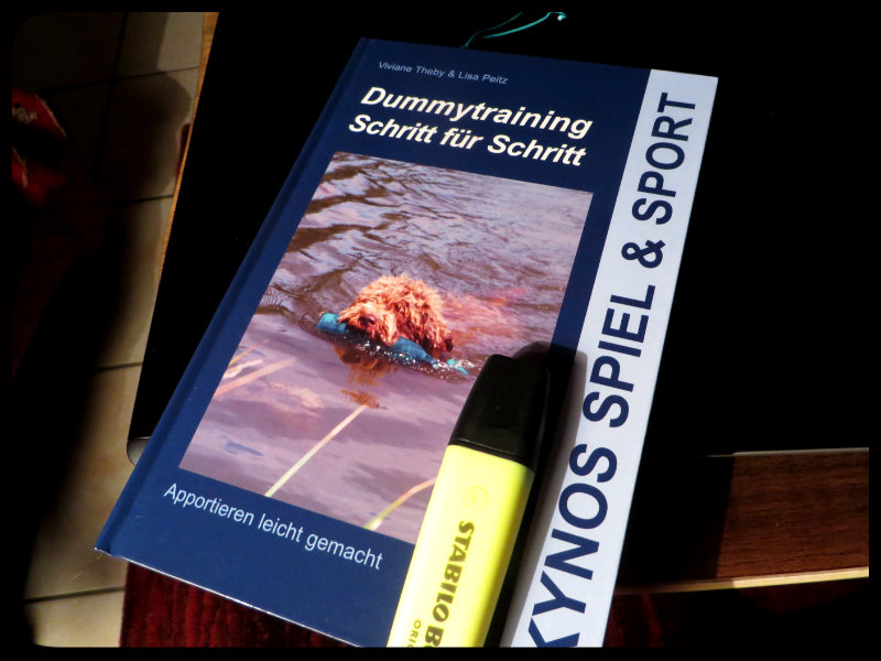 Igår började jag däremot läsa en av mina nyinköpta, tyska böcker om apporteringsträning steg för steg (Dummytraining Schritt für Schritt, Viviane Theby & Lisa Peitz). Boken är inte uteslutande inriktad på retrievers, och i vissa avsnitt har jag svårt att hålla koncentrationen… men här och där finns guldkorn och bra påminnelser. De går igenom apportering – dirigering – markering – sök i några steg per moment, och de sista stegen är långt ifrån enkla.