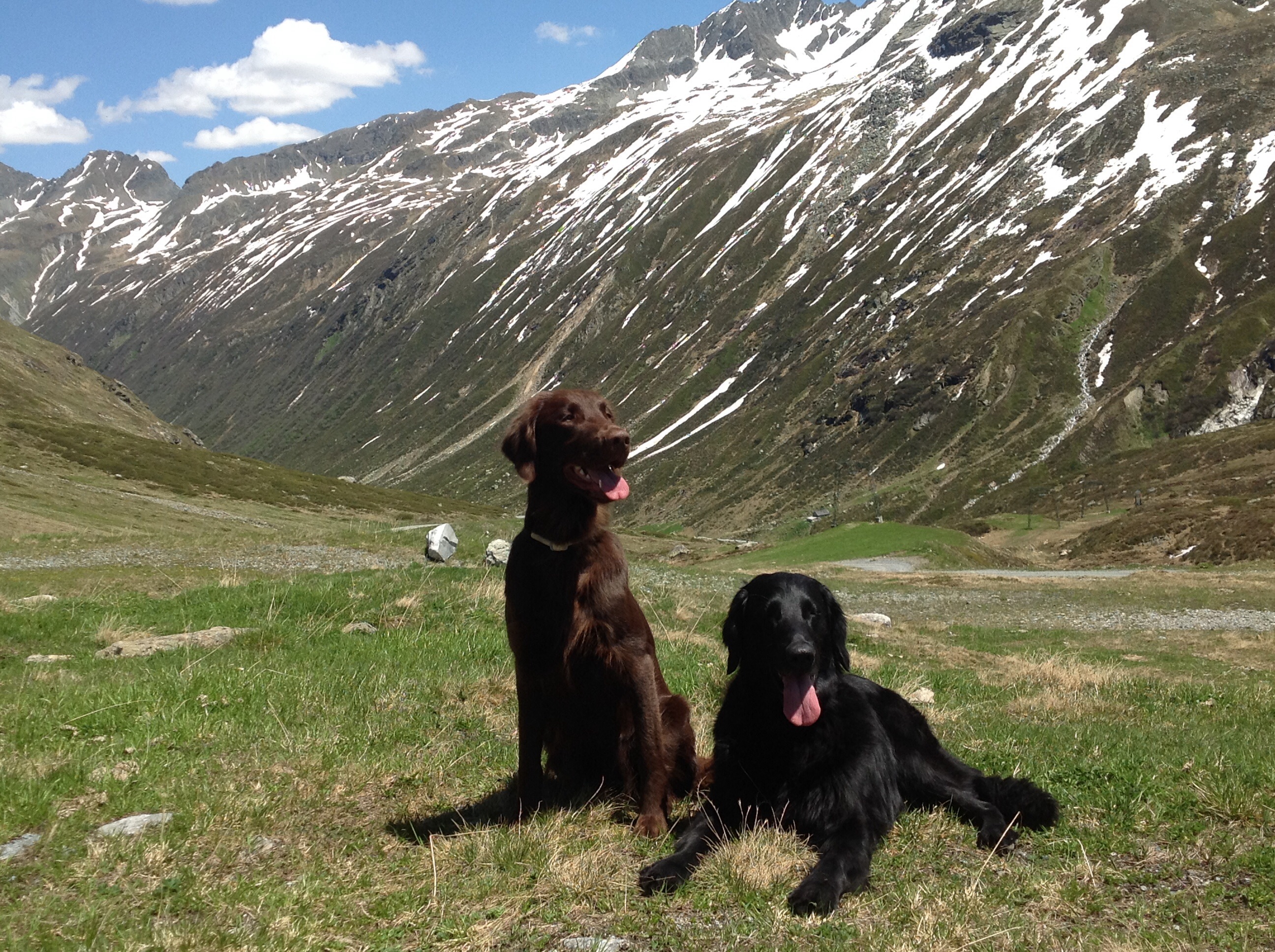 Det jag vill berätta om från det senaste året börjar nämligen med semester i juni förra året, 2014, då jag tog med hundarna på en bilsemester till österrikiska alperna, Tyrolen. Det var en resa jag hade velat göra länge och jag hade planerat att vara en vecka på tre olika ställen. Vi var först en vecka i Kappl och åkte på fina dagsutflykter därifrån. Vi vandrade i dalarna och bergssluttningarna. Delfis uppfödare, min vän Gaby Kipphardt, skrev till mig på Facebook (vi hade mycket kontakt via FB, där vi bland annat kunde sitta i timmar och diskutera flattar och träning på chatten – med avbrott för träning, middag eller sömnbehov) att hon varit mycket i Kappl och att hon bestämt ville se mina bilder därifrån. Och visst skulle det bli bilder…