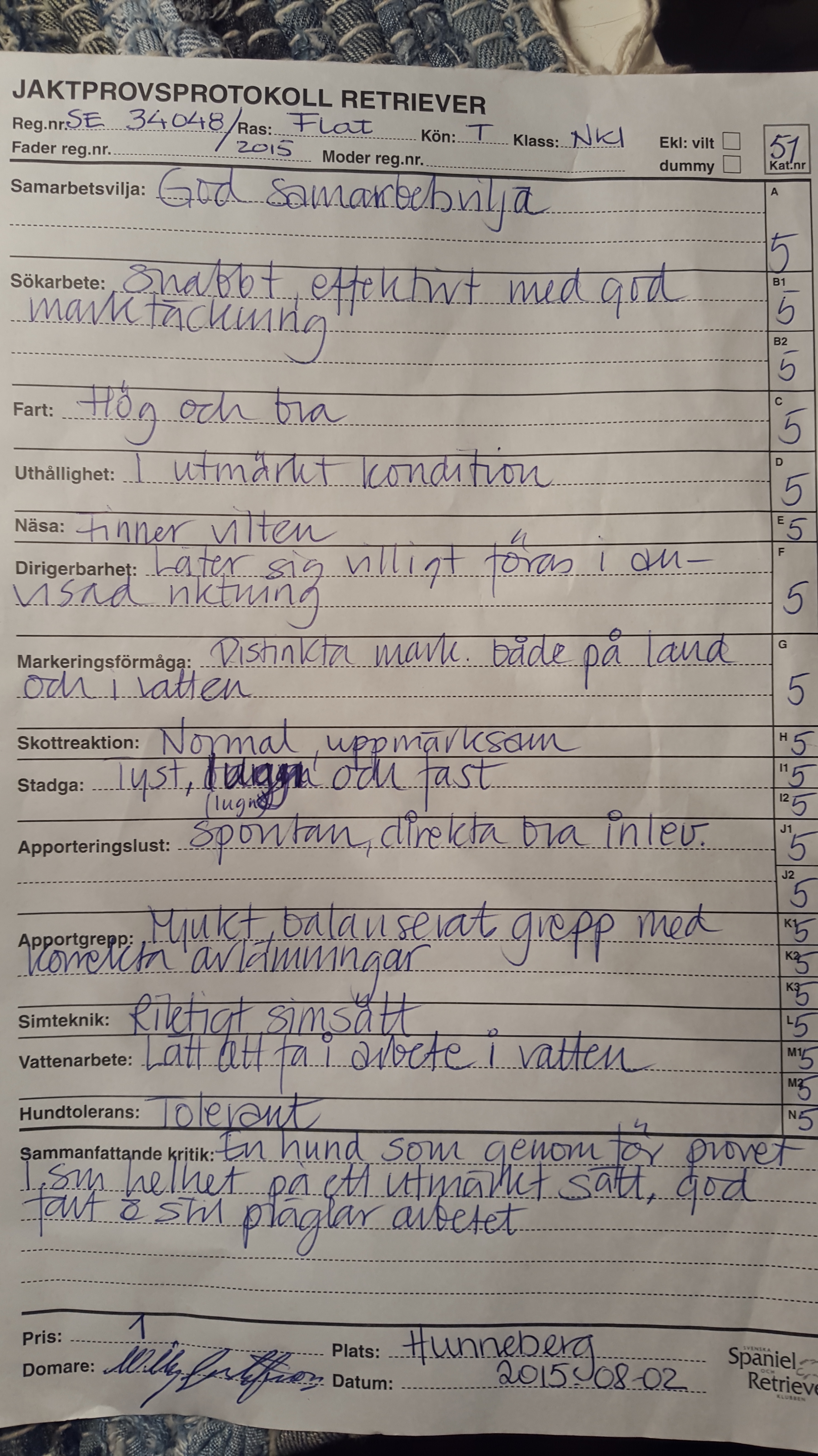 Provet bestod av två vattenmarkeringar, ett närsök vid/på vatten, ett sök med sex vilt på en liten mosse och upp på en bergsknalle, två markeringar i skogen Och till sist passivitet under vattenmarkeringar.