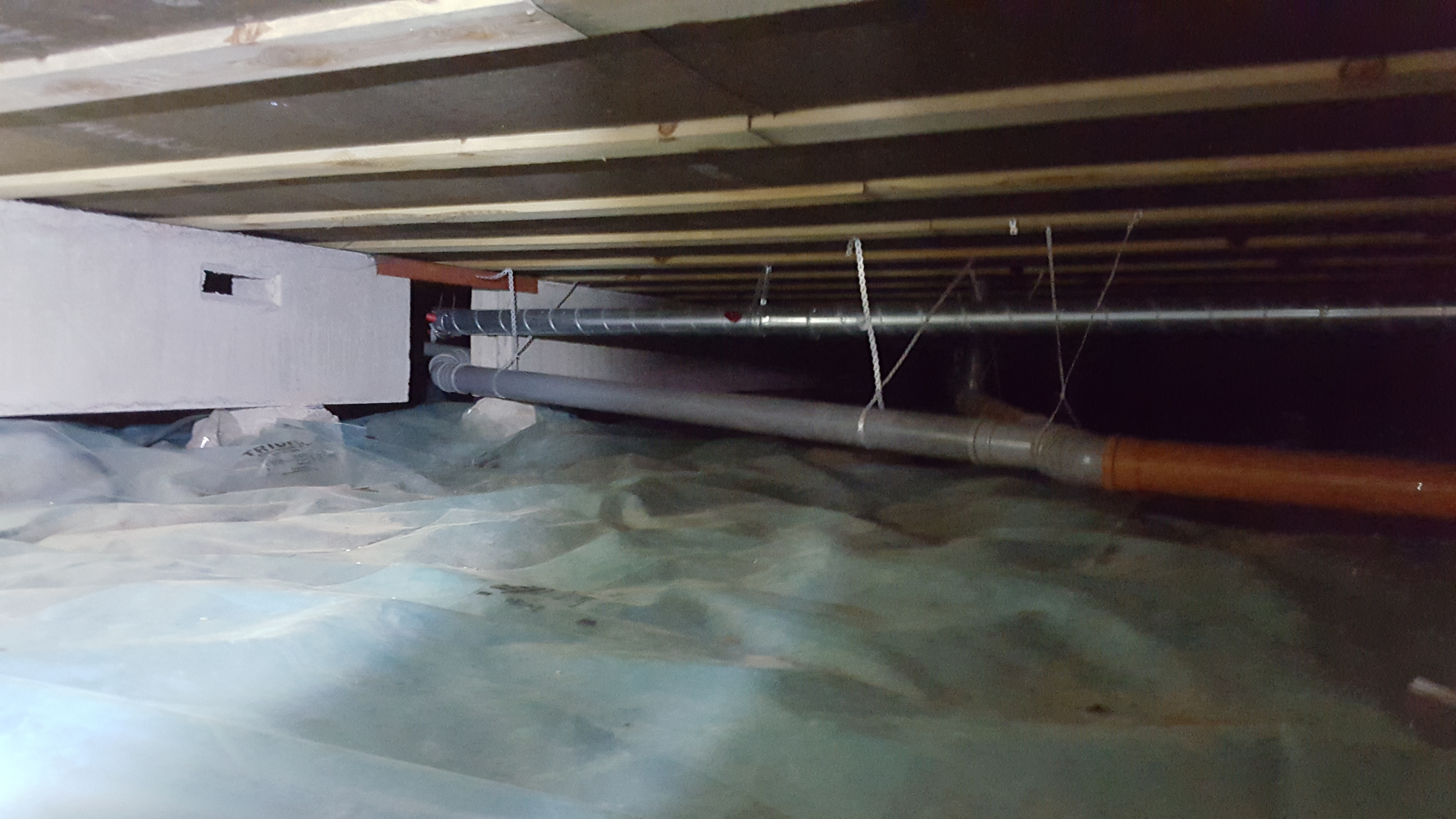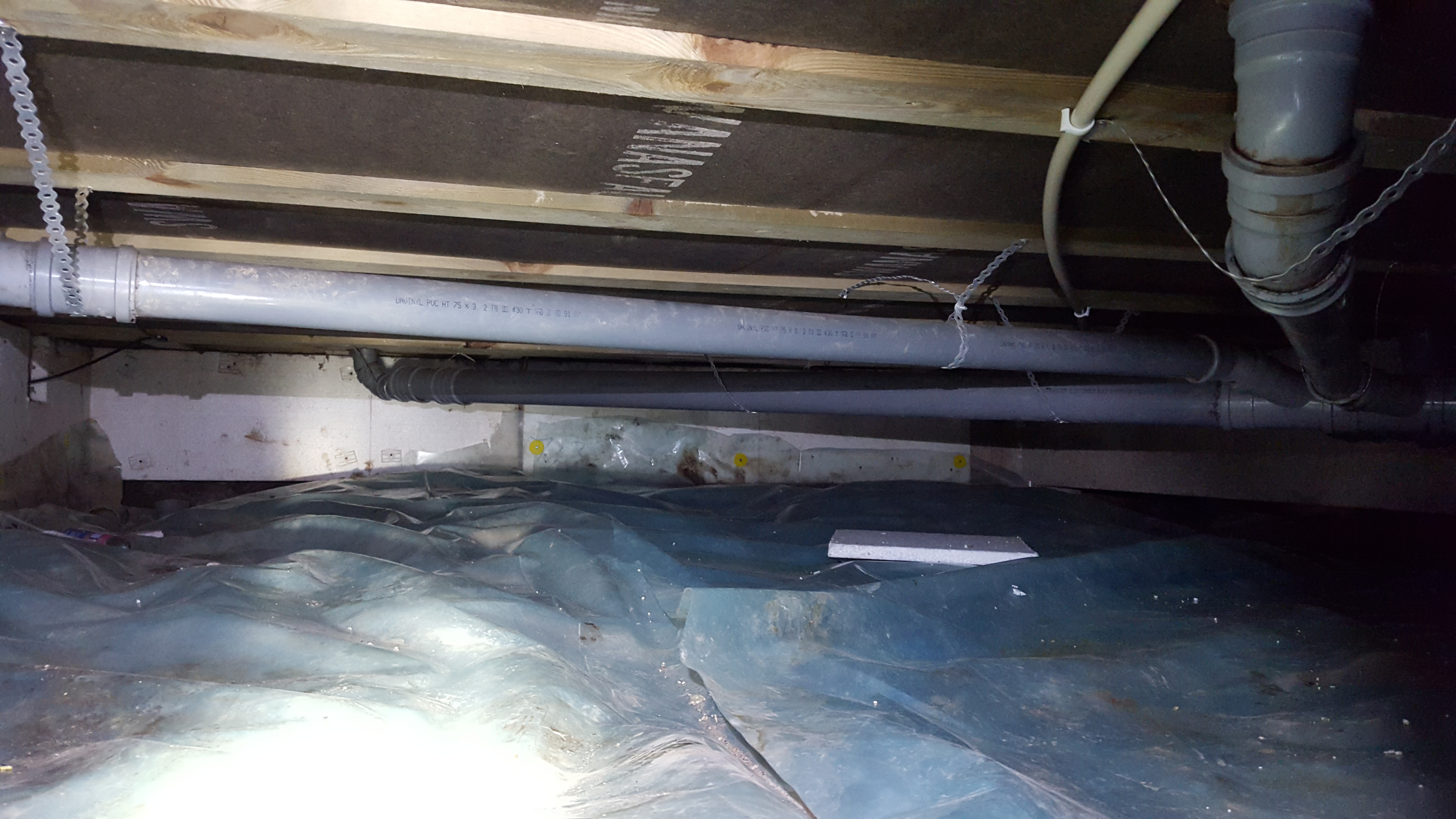 När jag ”råkade” komma förbi ett byggvaruhus ”råkade” jag köpa en stor rulle med plast – och rätt vad det var föll andan på igen, pannlampan och pappersoverallen åkte på och så gav jag mig in under huset igen.