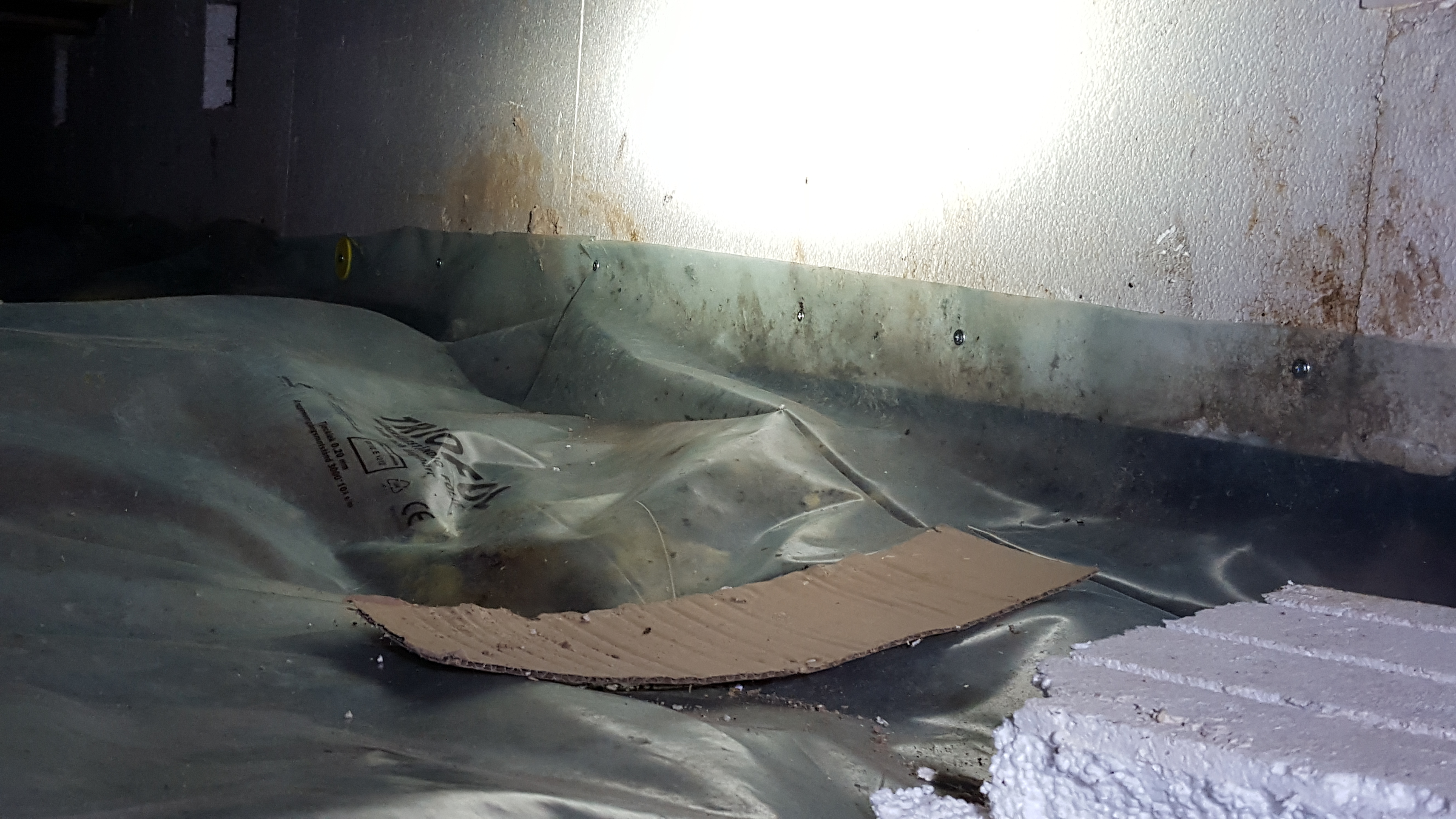Hela krypgrundens golv täcks alltså av tjocka plastskynken, men vad finns därunder? Hårt och knöligt var det, men bortsett från en och annan spindel (förvånansvärt få)  verkade det i alla fall inte finnas något levande vare sig under eller över. Inga tecken på möss, eller så… tack och lov!