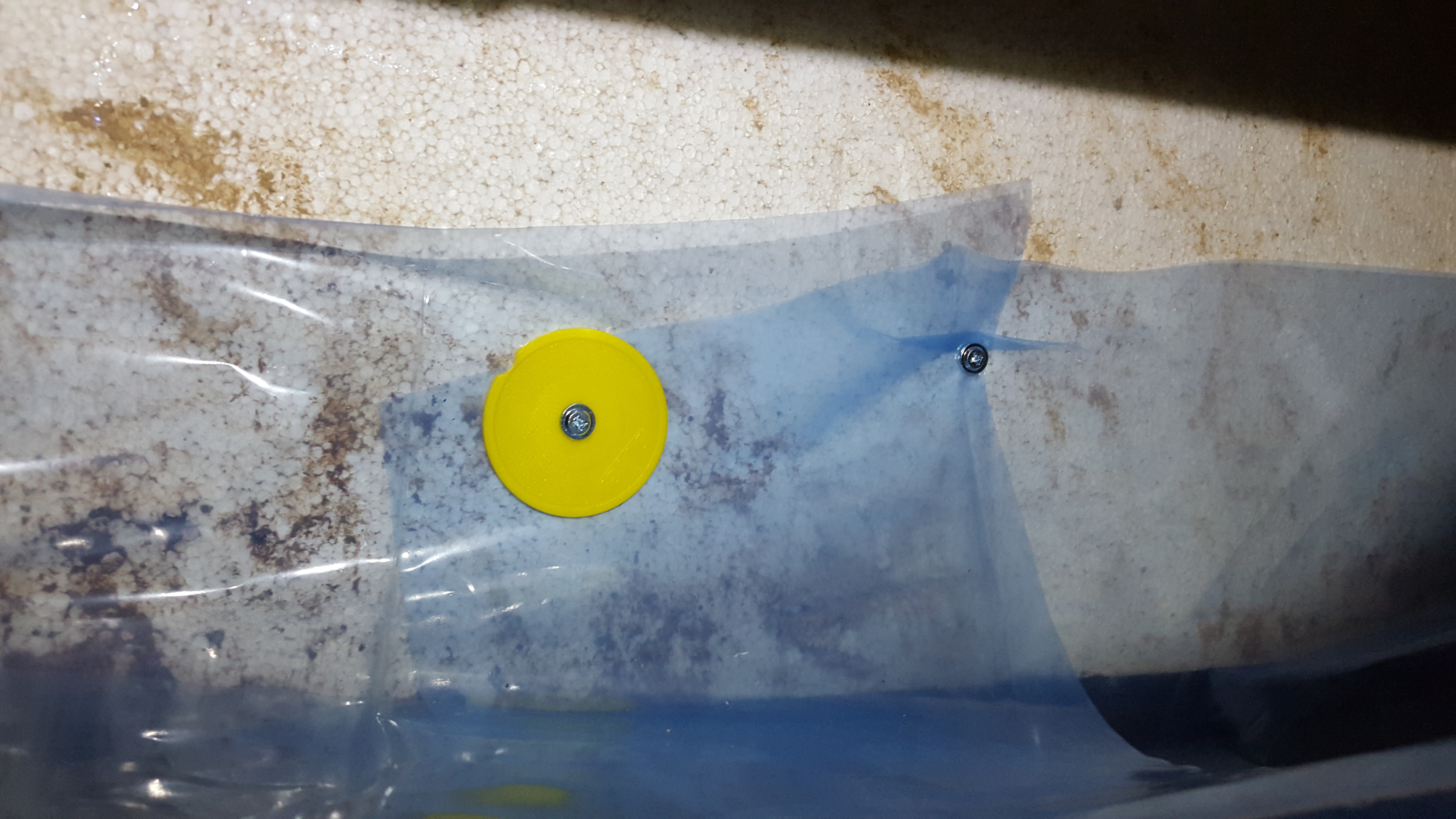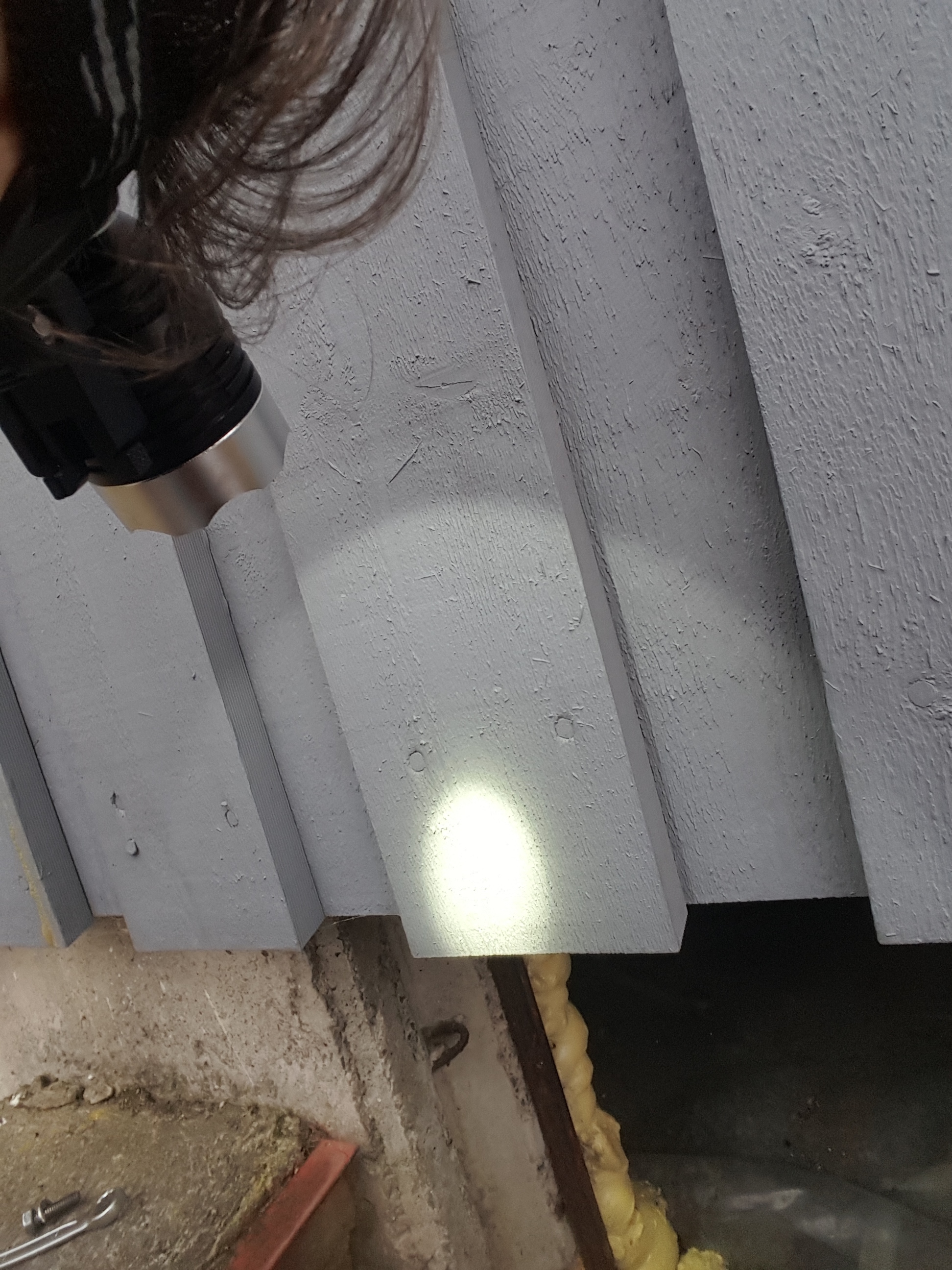 Jag iväg och köpte monteringsskruv och monteringsbrickor, och en dag när andan föll på, så gick jag ner under huset (ett projekt, bara det, men det är en annan historia)… Till mina tidigare målningsprojekt hade jag köpt hem en overall i mjukt papper – den kom väl till pass nu, liksom min för ändamålet nyinköpta pannlampa. Och handskar, givetvis! För nu skulle även spindelkokongerna – nya eller gamla – ner! Döda, allihop, intalade jag mig igen när jag nöp tag och drog loss.