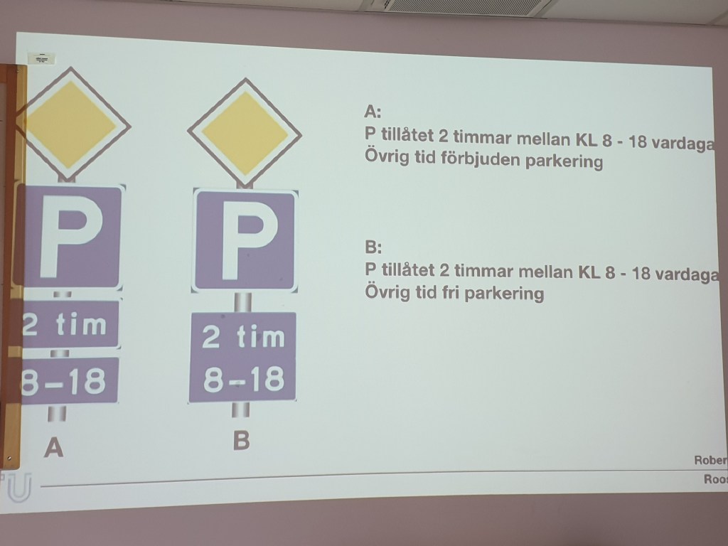 Helt utan hundar har jag också varit iväg på en kort uppdatering i vägskyltar och trafikregler, vilket jag tyckte kunde vara behövligt drygt 30 år efter att man tog körkort… De här skyltarna, t.ex. – håll för höger sida av bilden och säg vad A respektive B betyder?