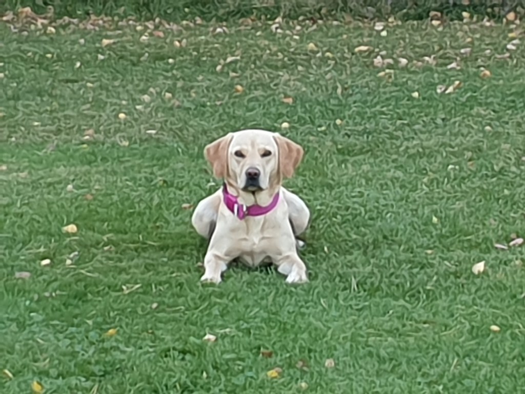 Det var Femma som skickades till en pinne där det skulle ligga en tennisboll, och jag hade för mig att det var lite högre och tätare gräs just där, så när hon inte hittade direkt var jag inte särskilt förvånad. Men hon brukar ju vara effektiv när hon letar, och jag höjde väl i alla fall på ögonbrynen när jag fick börja att stoppa Femma från att utvidga sökområdet och dirigera in henne igen. Om och om igen! Och Femma tog signal efter signal och letade och letade utan att hitta. Till slut fick jag stoppa henne – självklart fick hon rikligt med beröm för att hon varit en stjärna som tog mina signaler – och gick ut och tittade själv… Där var tomt. Jag tömde ryggfickan och räknade apporter och visst fattades en boll. Men hur säker jag än var på att det borde ligga en boll där, så var det t.o.m.t. Jag droppade en apport som Femma fick hitta istället, sedan tog vi lite härliga markeringar, samtidigt som jag hoppades att vi skulle springa över en borttappad boll som förmodligen trillat utanför fickan vid något tillfälle. Till sist gick jag och samlade ihop pinnarna för att gå in. Vid en av de andra pinnarna låg bollen i en grästuva. Joråsåatt…
