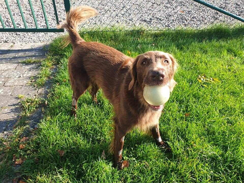 Frampå förmiddagen igår var Delfi riktigt pigg och studsade ut – haltandes, i och för sig – på gräsmattan och skällde med en boll i munnen – då är flattebruden glad. Klart jag måste föreviga det: