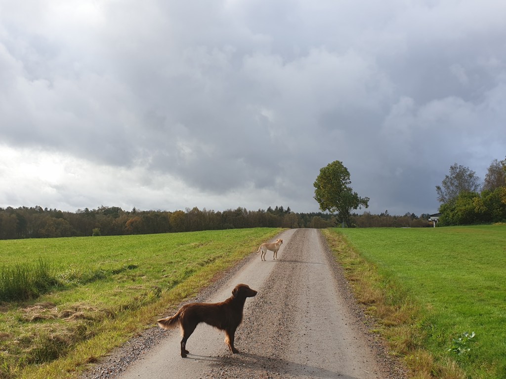 Sol i sinnet har jag i alla fall efter att veterinären häromdagen hörde av sig med Delfis provsvar, som mycket riktigt visade på anaplasma. Ett tidigare prov hade ju inte visat på anaplasma, medan hennes symptom tydligt pekade åt det hållet, vilket fick veterinären att vilja skicka iväg ett prov för säkrare svar. Och det provet bekräftade alltså deras teori. Jag har tidigare trott att anaplasma är en lömsk sjukdom som tenderar att komma tillbaka, men så är det inte, fick jag veta, utan det krävs att man har lika stor otur igen med en ny fästing som smittar hunden. Så när Delfi har avslutat sin antibiotikakur så friskförklaras hon och då kan vi börja trappa upp motionen så sakteliga igen. Tack och lov! För enligt Delfi kan hon redan vara med på allt – och lite till… Jag skulle säga att hon är lite ovanligt pigg och studsig… det spritter i de friska flattebenen, och igår fick hon en såpass lång koppelpromenad så att hon kunde få sin kära stretching efteråt.