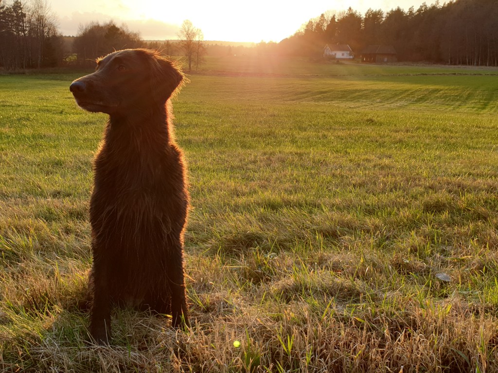Delfi studsar runt mest hela tiden och går nu med på fullängdspromenader. Lydnadsträning har hon fått hela tiden, och vissa delar av jaktträningen har hon fått vara med på den senaste veckan, men nu körde jag först ett sök på en blöt mosse, därefter ett ordentligt dirigeringspass med båda hundarna med flera olika punkter på en stor äng. Linjer och långa höger- och vänsterslag. Äntligen är Delfi på banan igen!