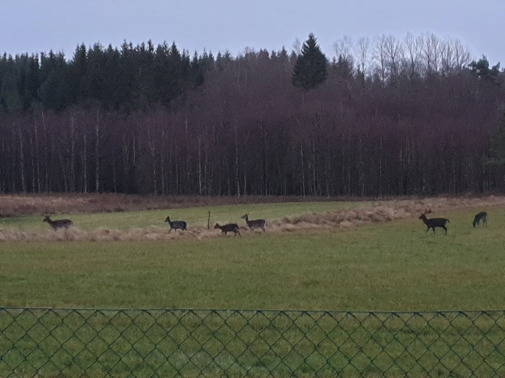 Hjortarna strövar förbi ute på ängen, och jag får äntligen se den ståtliga bocken som troligtvis var den som brölade för fullt dygnet runt under en vecka fram till för några dagar sedan. Han har det lugnare nu, och åh så tjusig han är med sin krona (näst längst till höger på min suddiga bild).