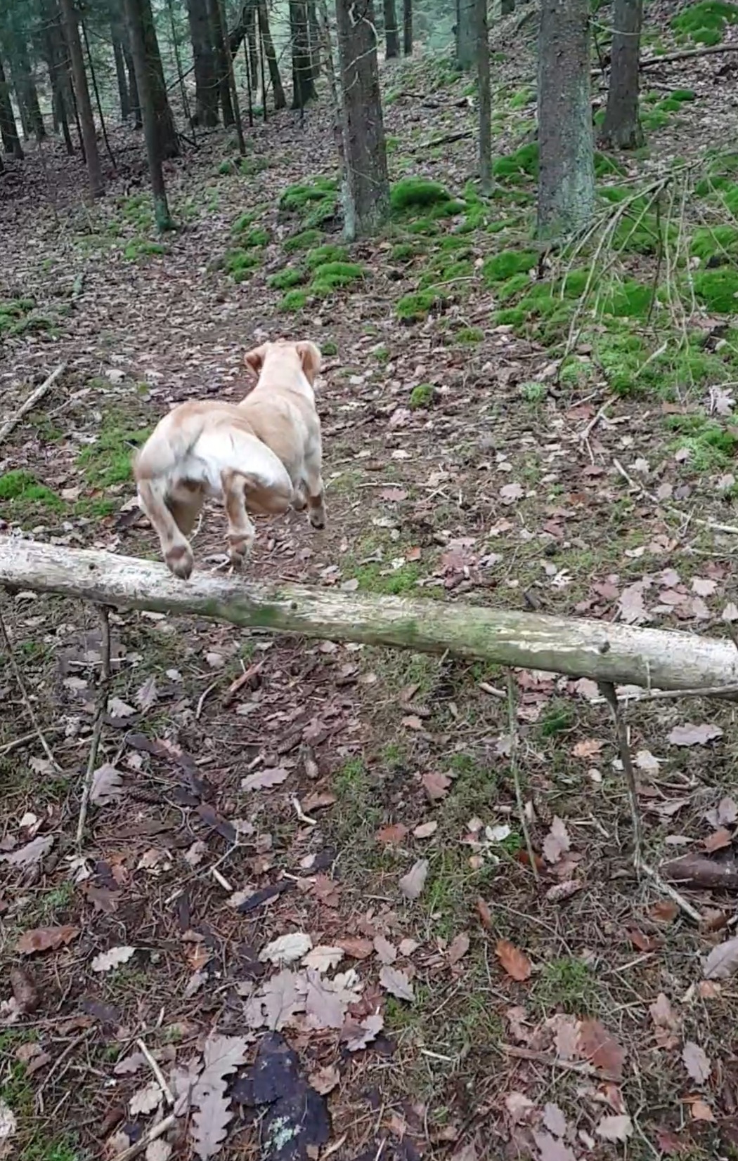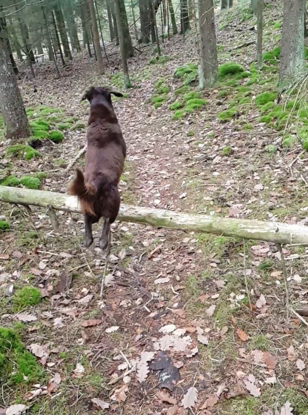 Lite kul är det att se hundarnas val på ett annat ställe där det sedan några månader tillbaka ligger ett träd tvärs över stigen. Både Femma och Delfi har tidigare spontant valt att gå under det trädet. Ibland har jag stannat och använt trädet som hopphinder för lite träning, men när de passerade själva gick de oftast under. För dem är höjden sådan att det är lätt för dem att gå under, så det sparar väl energi. (Piaf gick runt.) Nu den senaste tiden har de ändrat taktik, och båda två skuttar över trädstammen, även när de väljer helt själva. Kul, tycker jag, och funderar lite över om Femma tar efter Delfi, som är i bättre form nu än på länge.