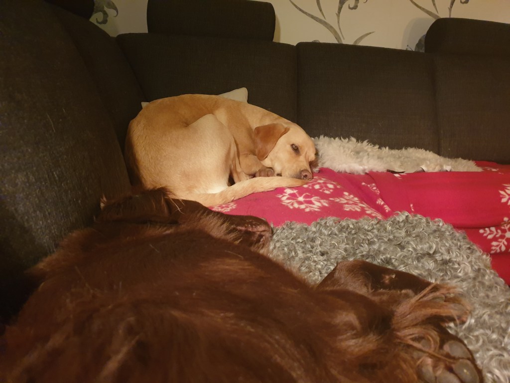 Femma har tydligen bestämt sig för att prova något nytt – nämligen att inte ligga precis intill/framför/på mina ben i soffan utan att ligga helt själv. Samtidigt ligger Delfi allt oftare nära mig, men oftast vid sidan om mig. Femmas sätt att ligga intill mina ben har nästan varit lite störande, särskilt när jag velat resa mig från soffan, och jag nästan har fått be fröken Femma om lov, eller jag har i alla fall fått väcka henne och/eller knö bort henne från mina ben. Nu på sistone har jag tyckt att hon varit lite lättare att väcka och flytta, men tydligen tycker hon själv att då kan det kvitta – bättre att sova i ett eget hörn av soffan…