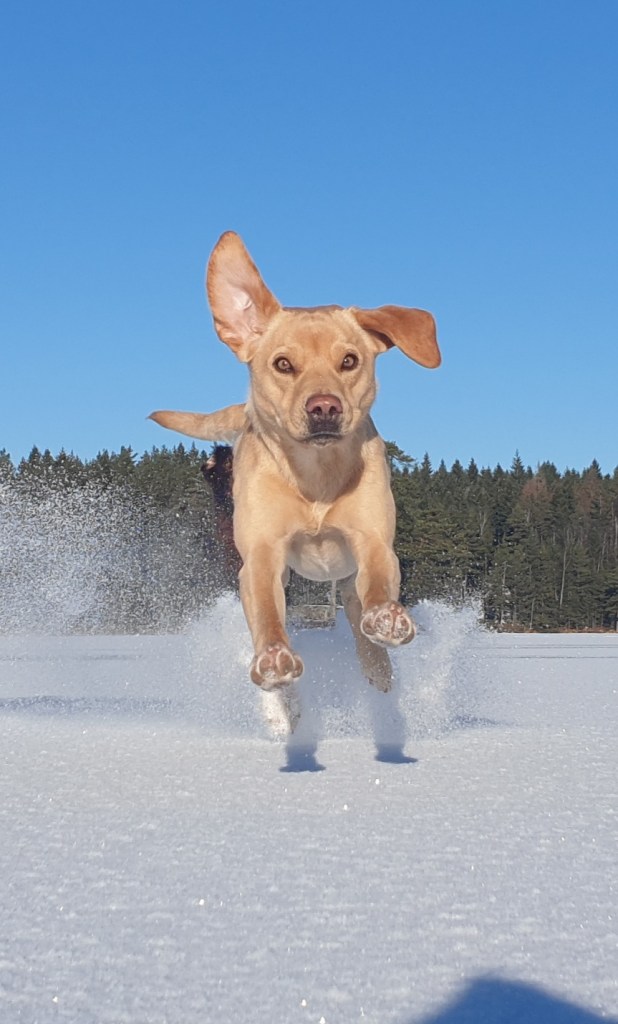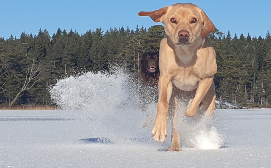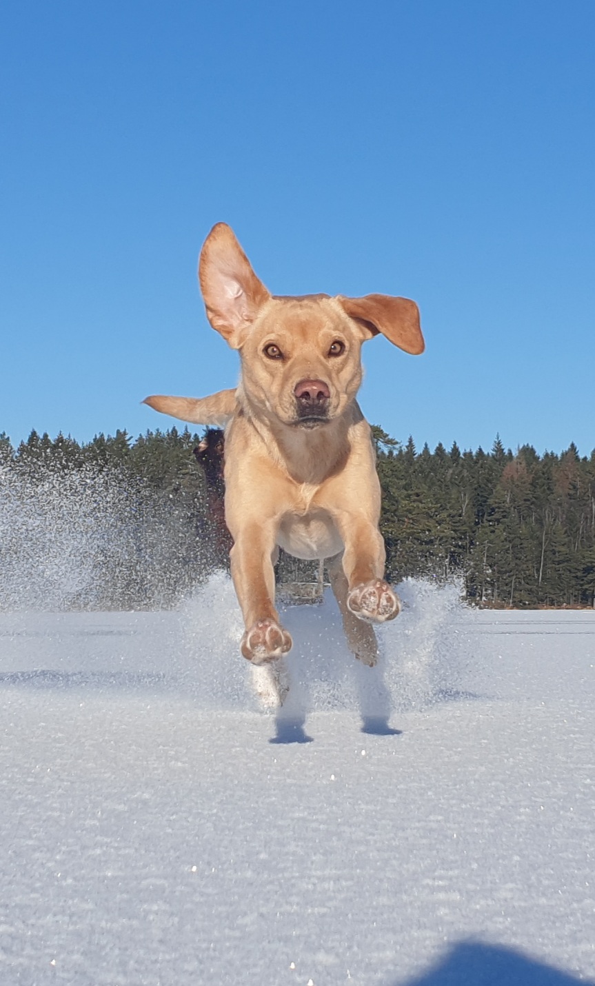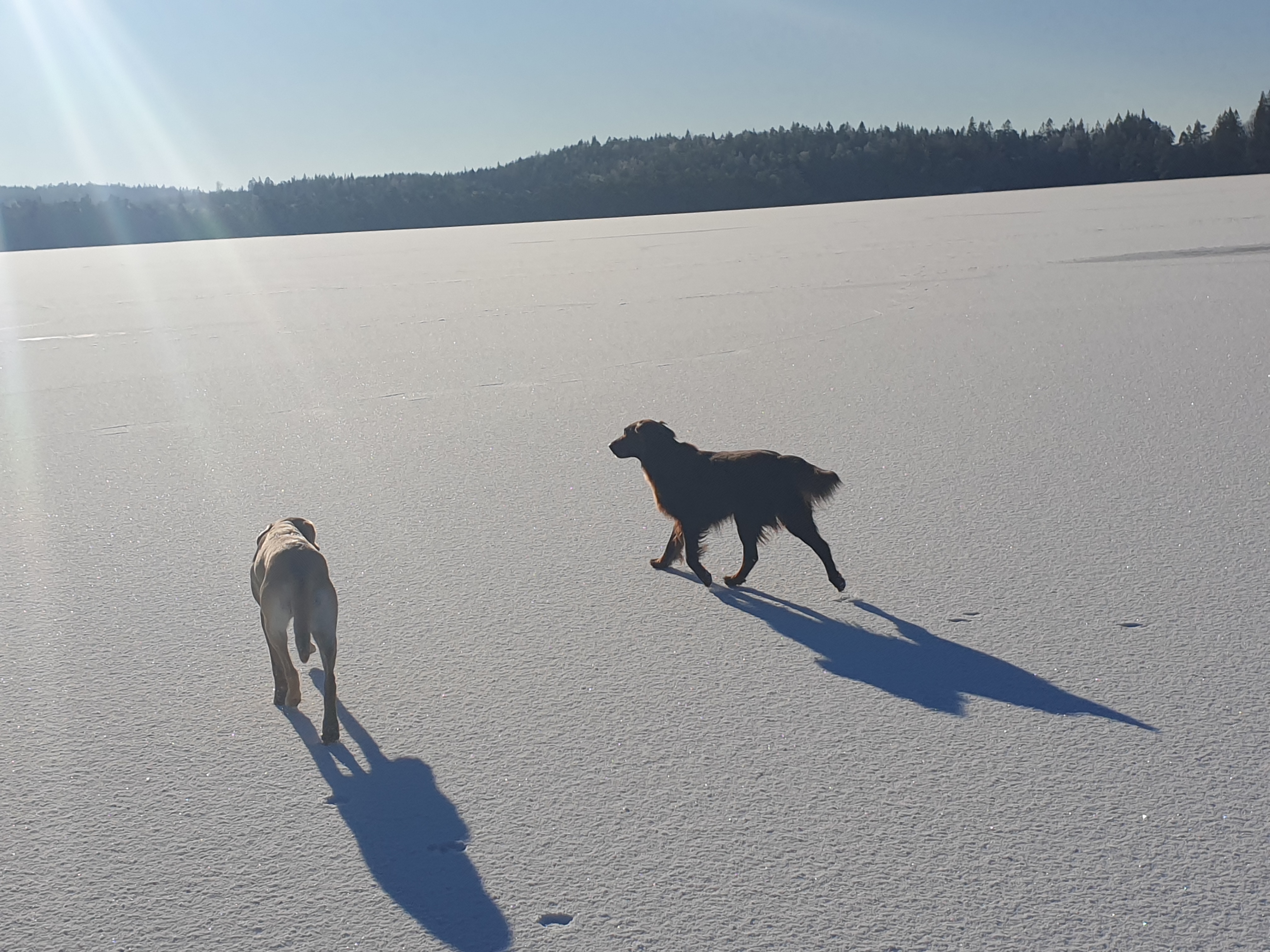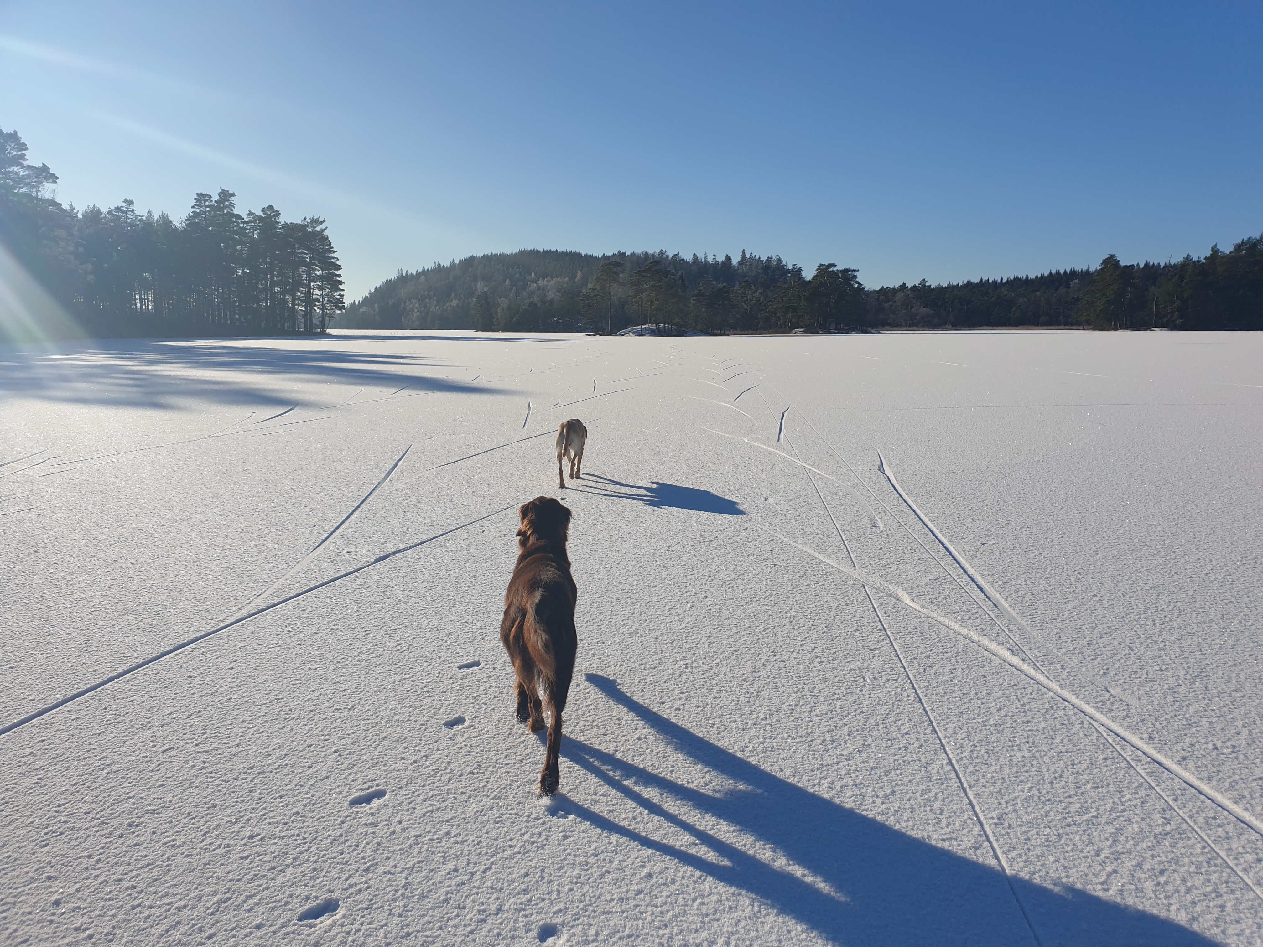 Det fina med isen den här helgen var att den nu är 20 cm tjock (jag fick sticka ner hela handen i ett pilkhål för att känna den nedre kanten med fingertoppen) och att det låg ett lager med snö på isen, vilket tog bort halkan. Det var bara att promenixa fram, vilket både Delfi och jag uppskattade. Femma uppskattar ju alltid en promenad på isen…