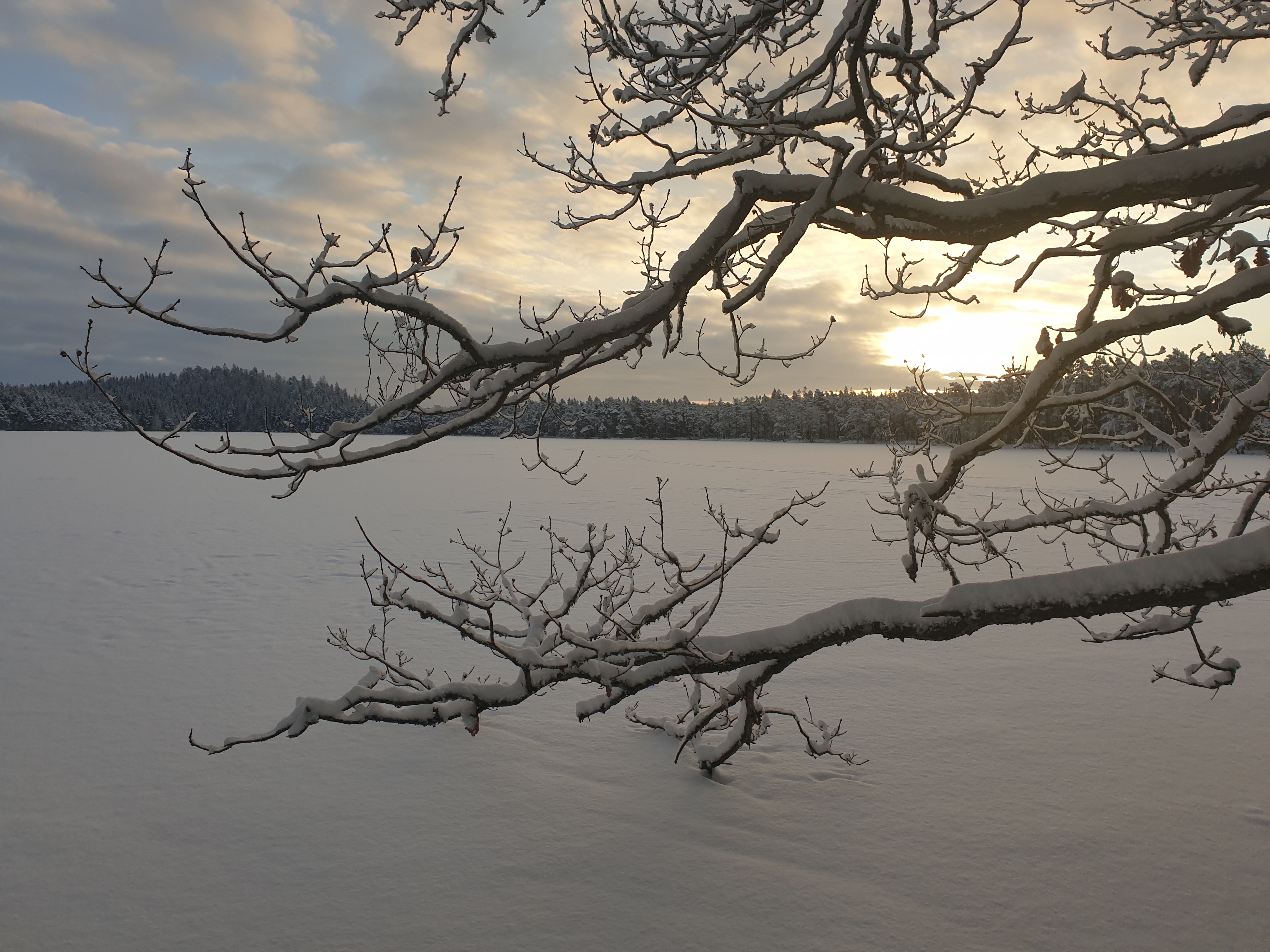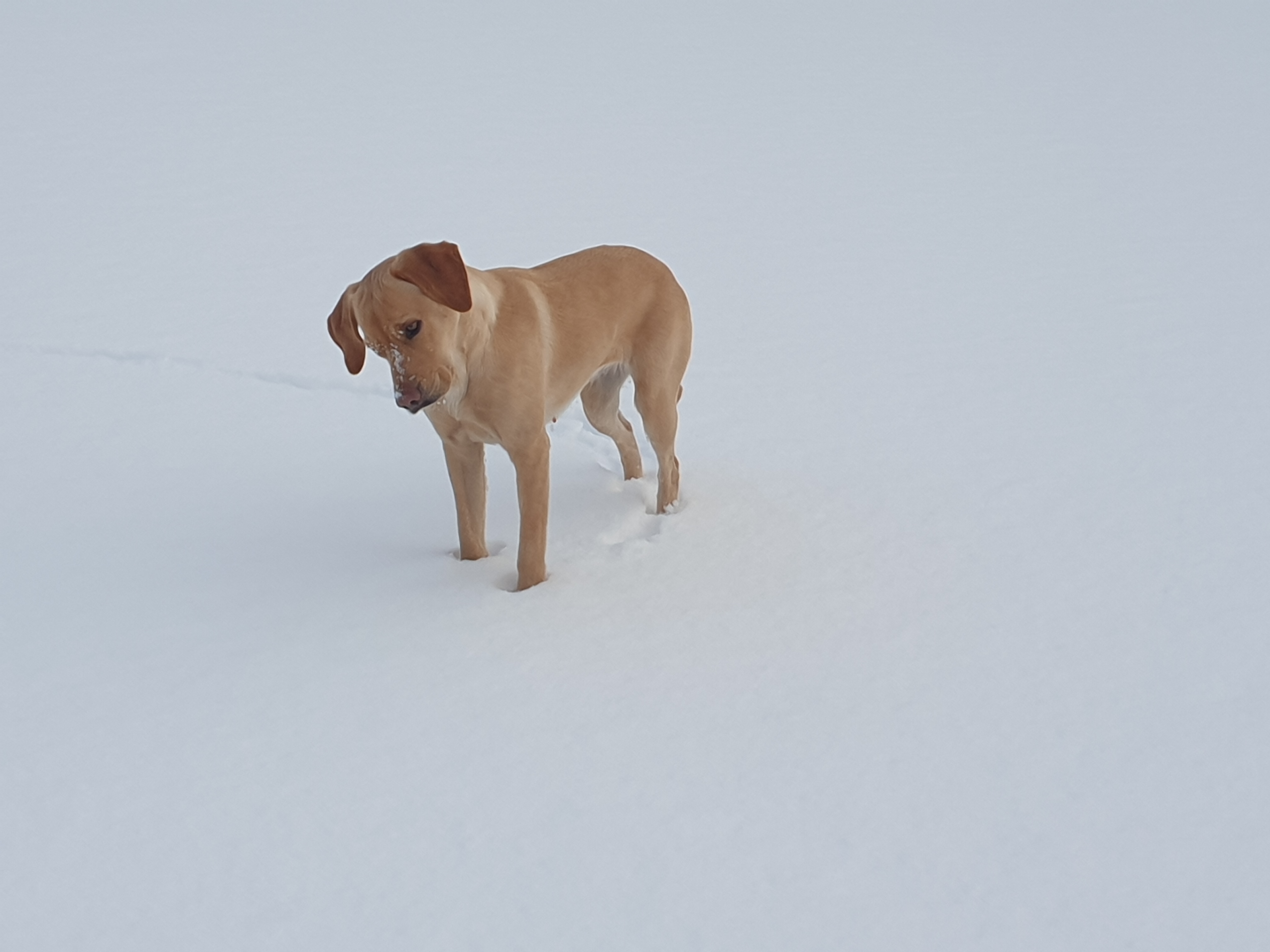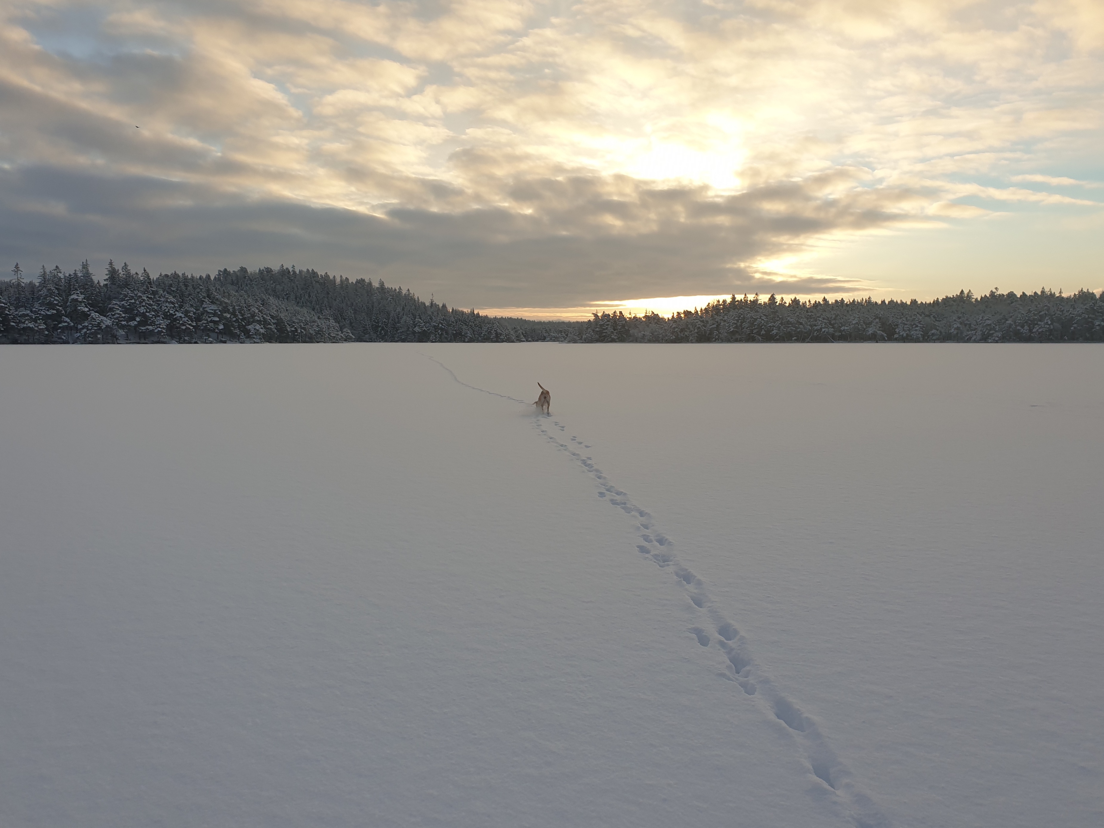 Det kom rejält med snö, och igår fick vi verkligen pulsa fram över isen på sjön. Delfi är inte jätteroad av att få isklumpar mellan trampdynorna, något som Femma slipper helt och hållet. Det är verkligen opraktiskt med lång päls!