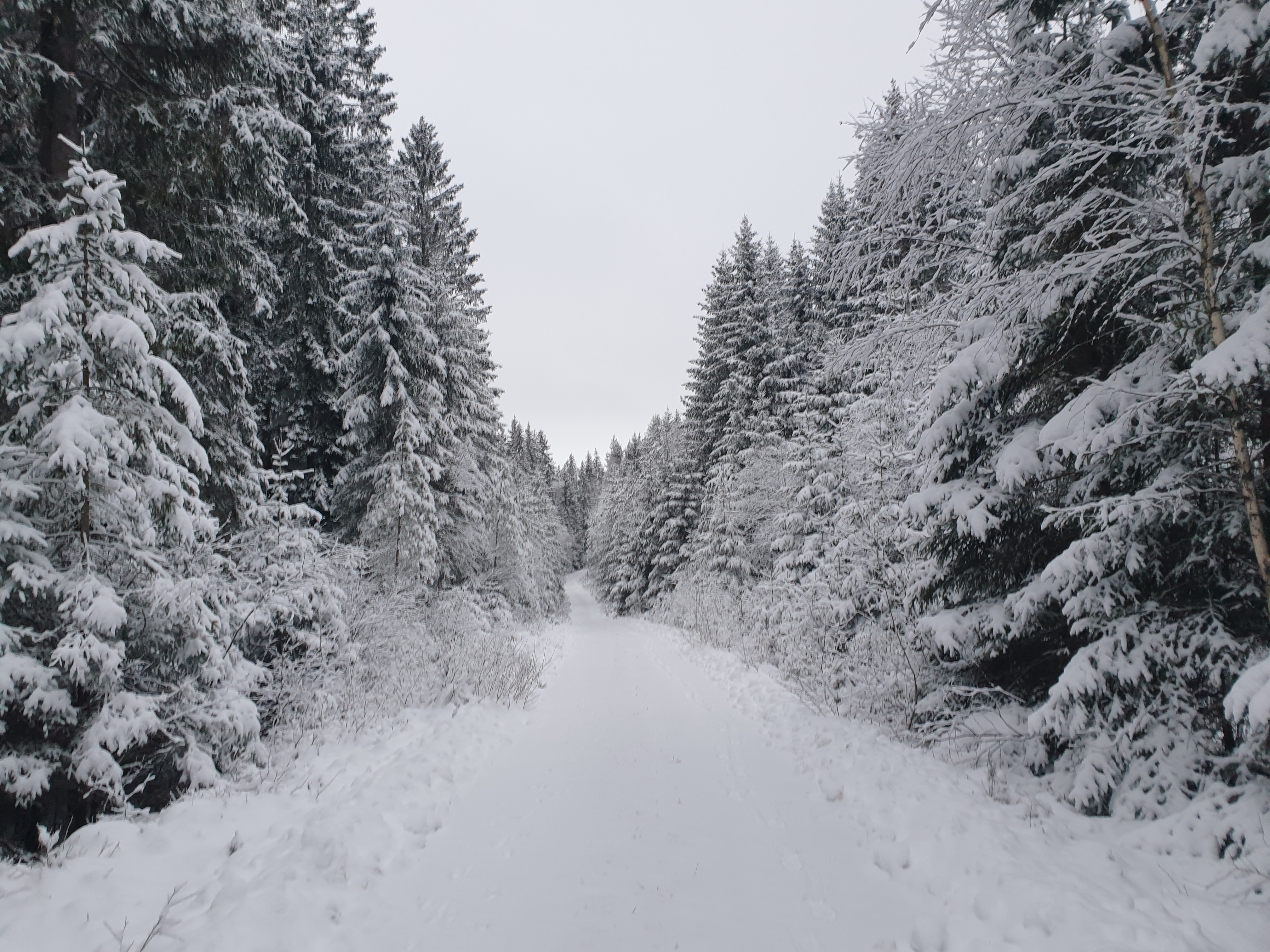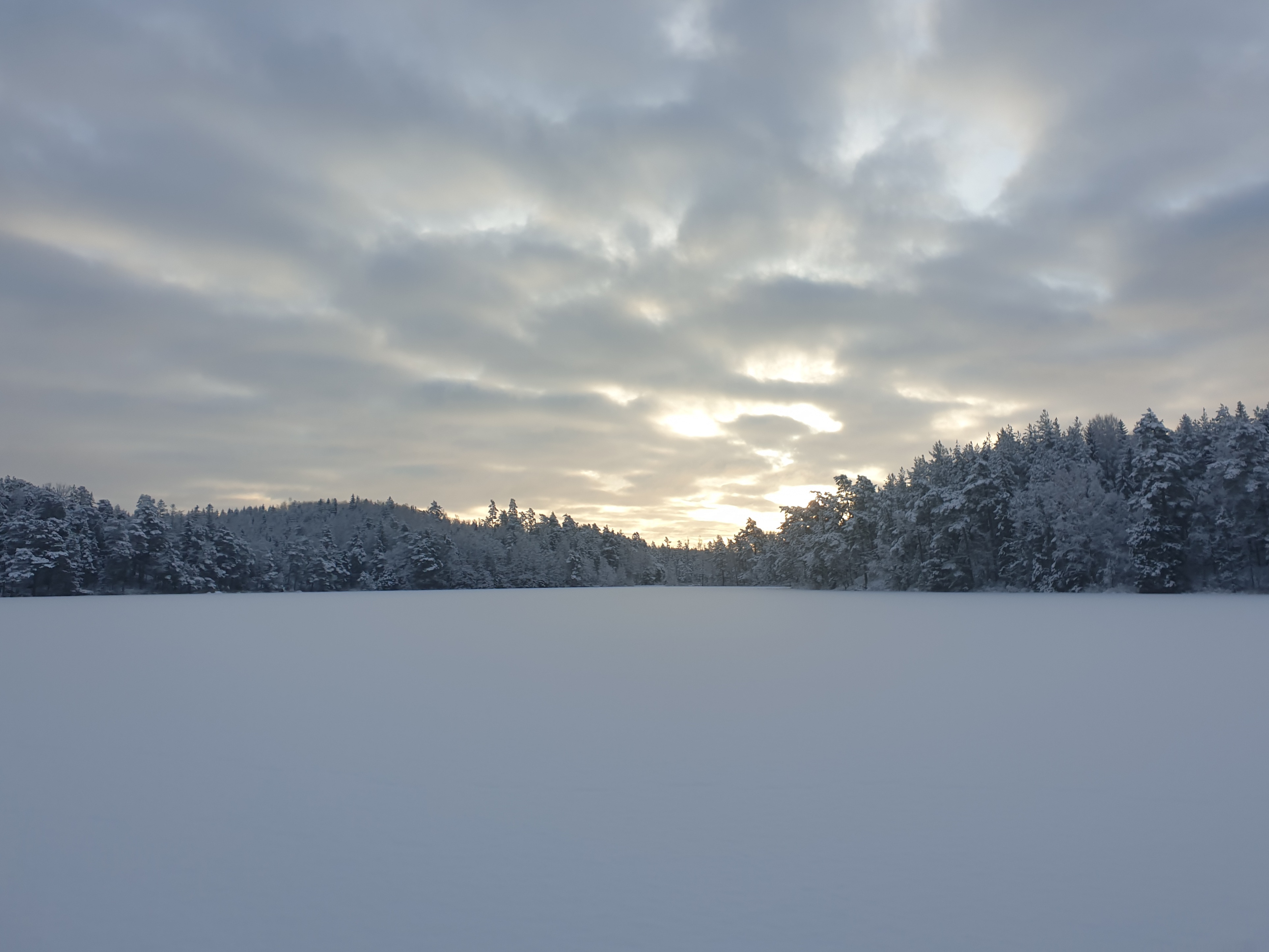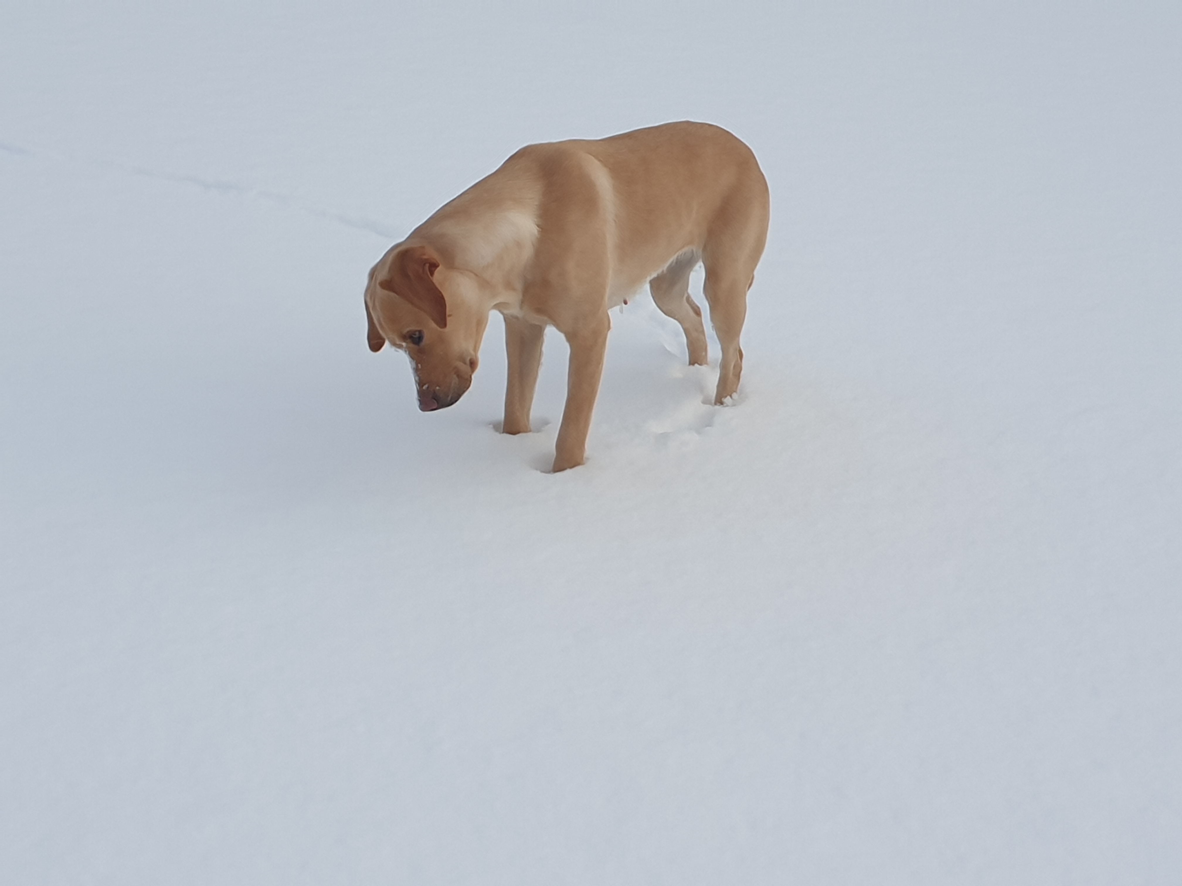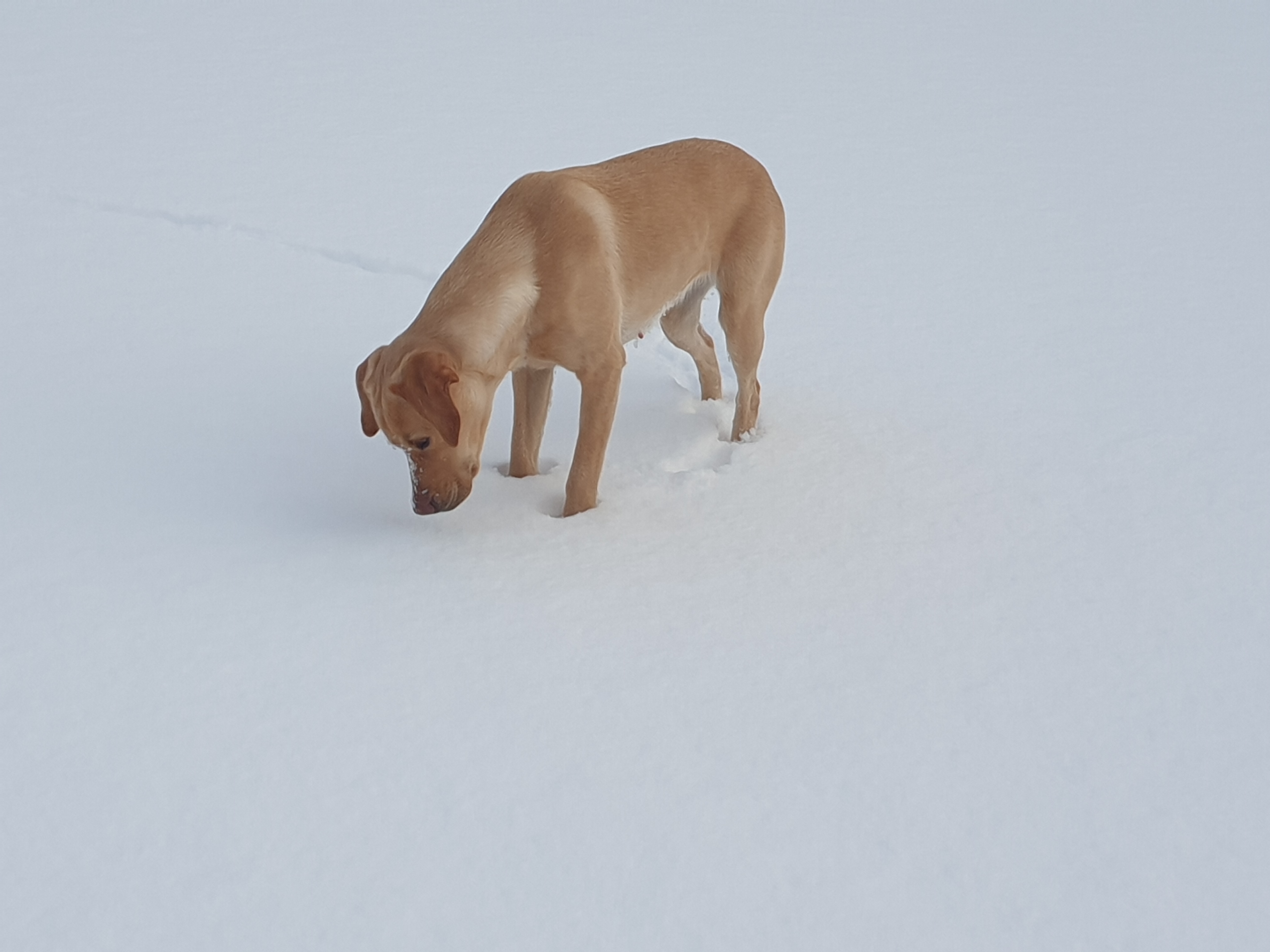 Det kom rejält med snö, och igår fick vi verkligen pulsa fram över isen på sjön. Delfi är inte jätteroad av att få isklumpar mellan trampdynorna, något som Femma slipper helt och hållet. Det är verkligen opraktiskt med lång päls!