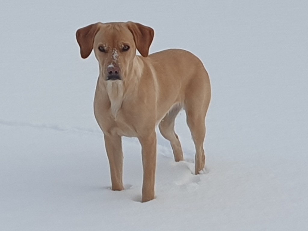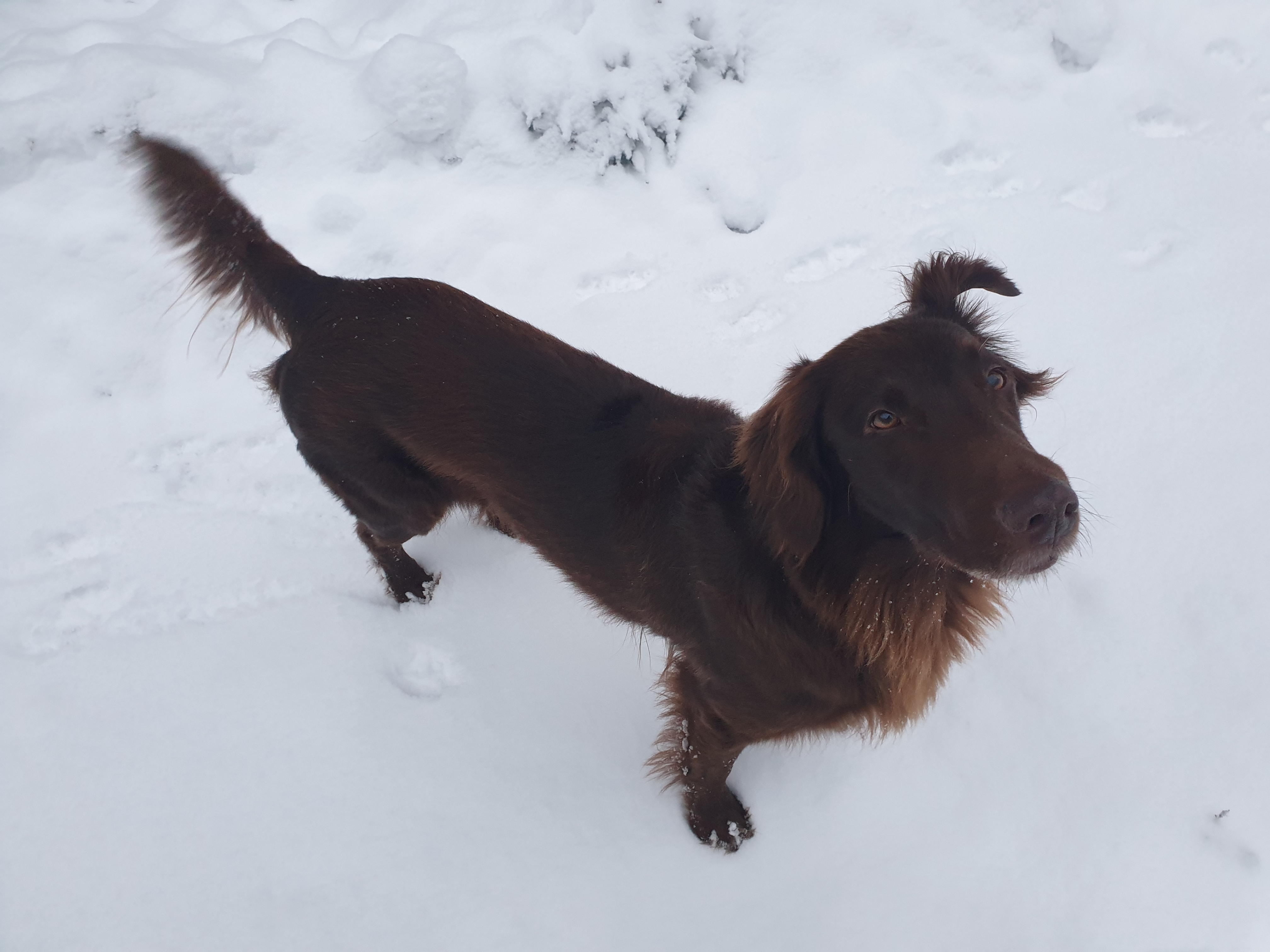 Det är lite överraskande att Femma, som avskyr att springa över blöta fält eftersom det skvätter upp vatten på magen… inte har något alls emot att springa genom snö i full fart. Igår körde vi ett träningspass i snön (vi har ju hemläxa…) och hon körde på i full fart. Att ta snöiga, rent av isiga dummies och bollar är inte heller något problem. Hon är rolig, den lilla Femman. Och riktigt snygg också, om jag får säga det själv… Hon har härliga färger nu på vintern – många kommenterar hennes mörka öron – och har blivit alldeles lagom musklad nu, i fullvuxen ålder.