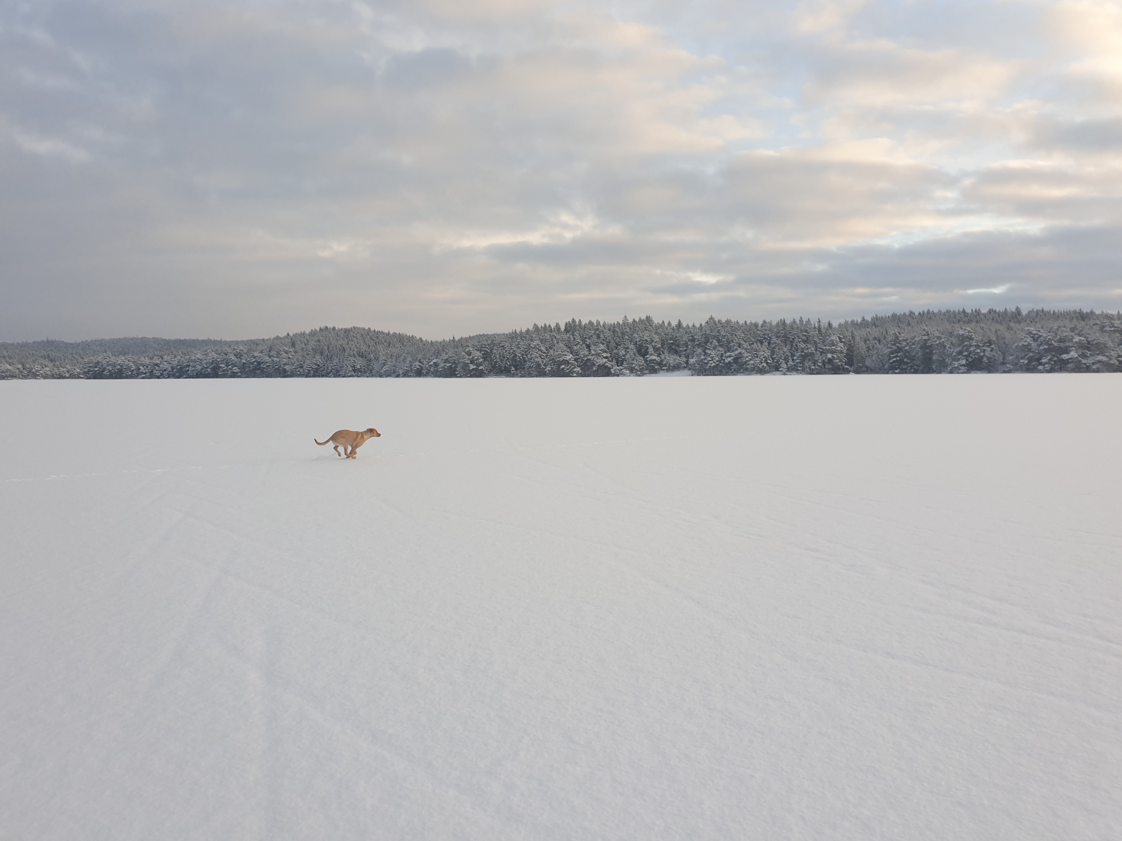 Det kom rejält med snö, och igår fick vi verkligen pulsa fram över isen på sjön. Delfi är inte jätteroad av att få isklumpar mellan trampdynorna, något som Femma slipper helt och hållet. Det är verkligen opraktiskt med lång päls!