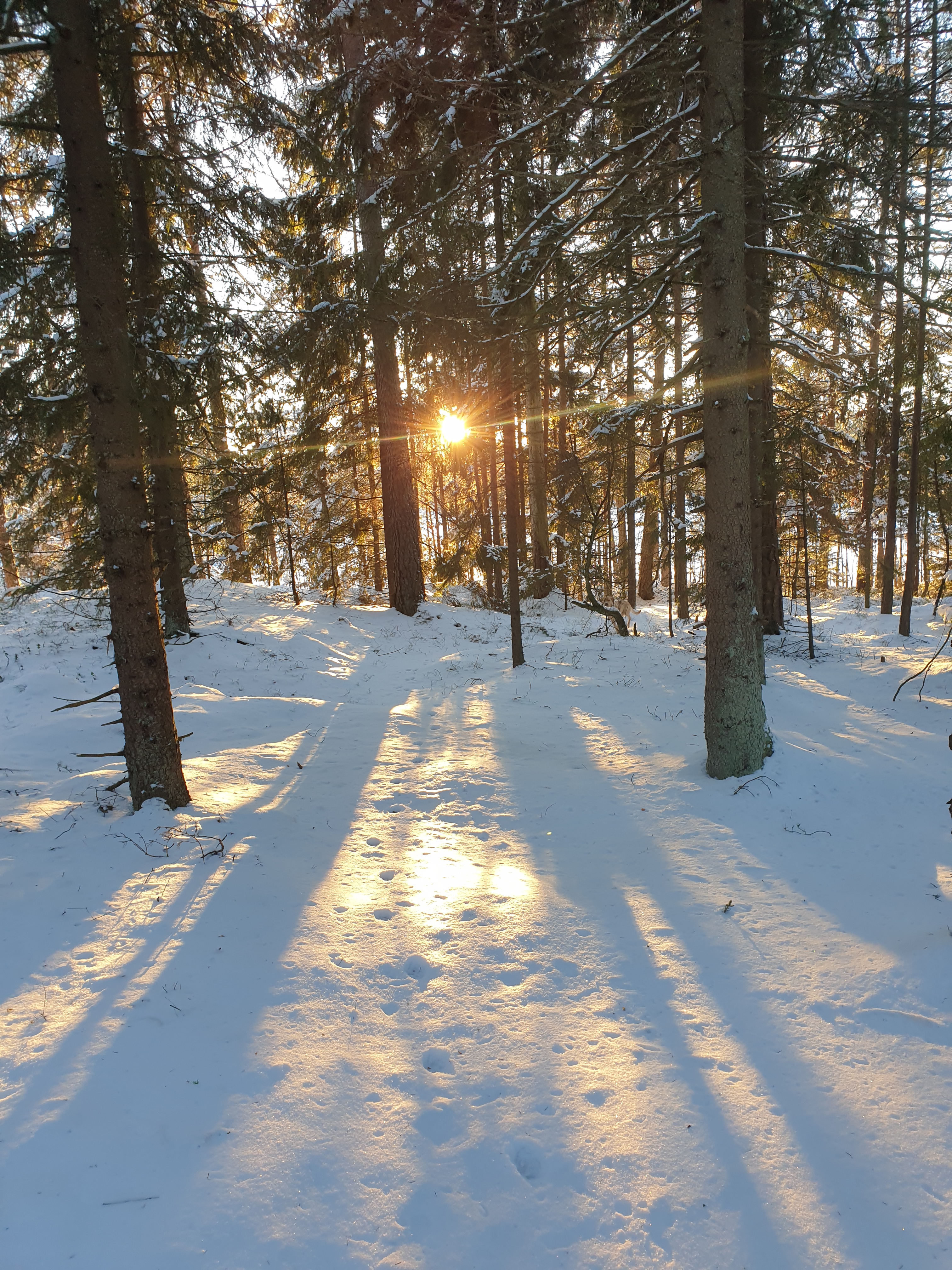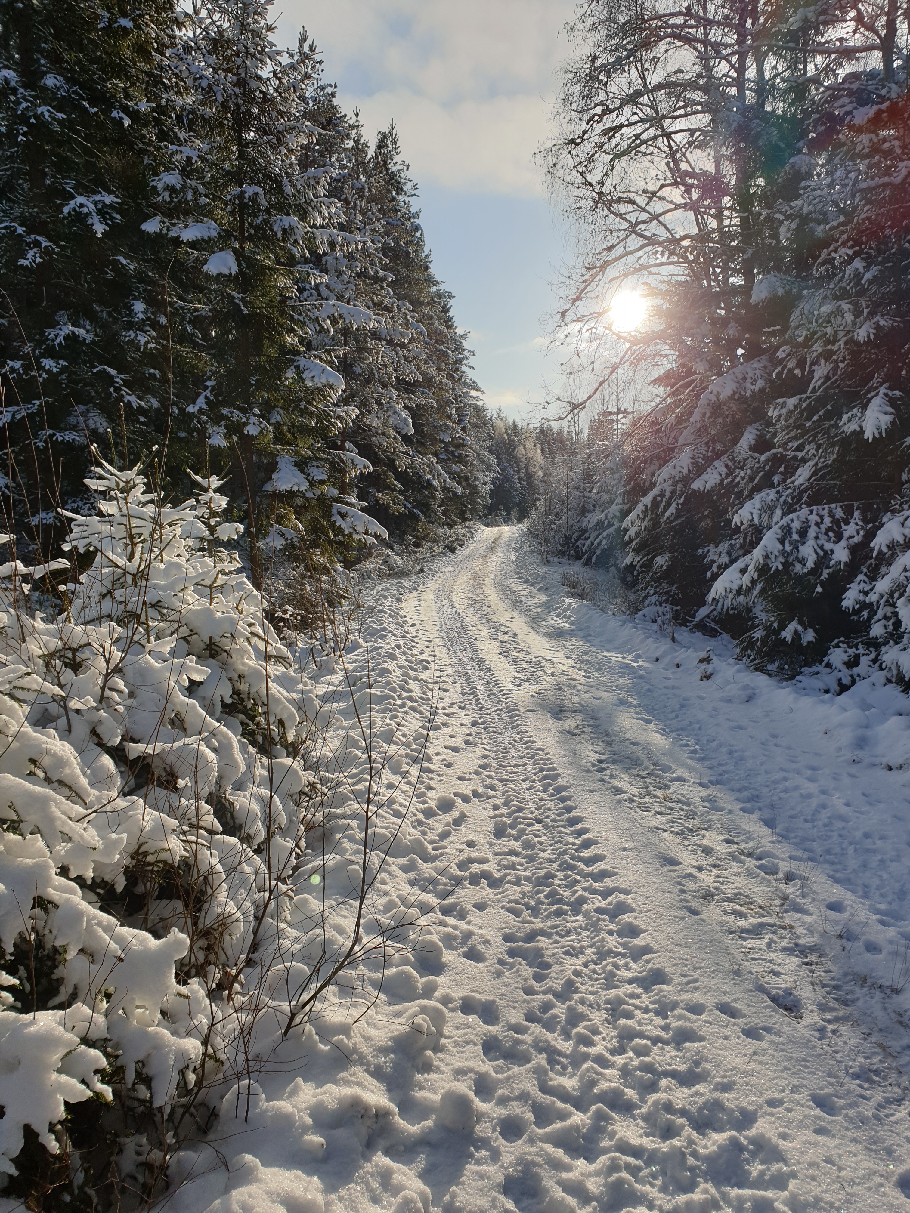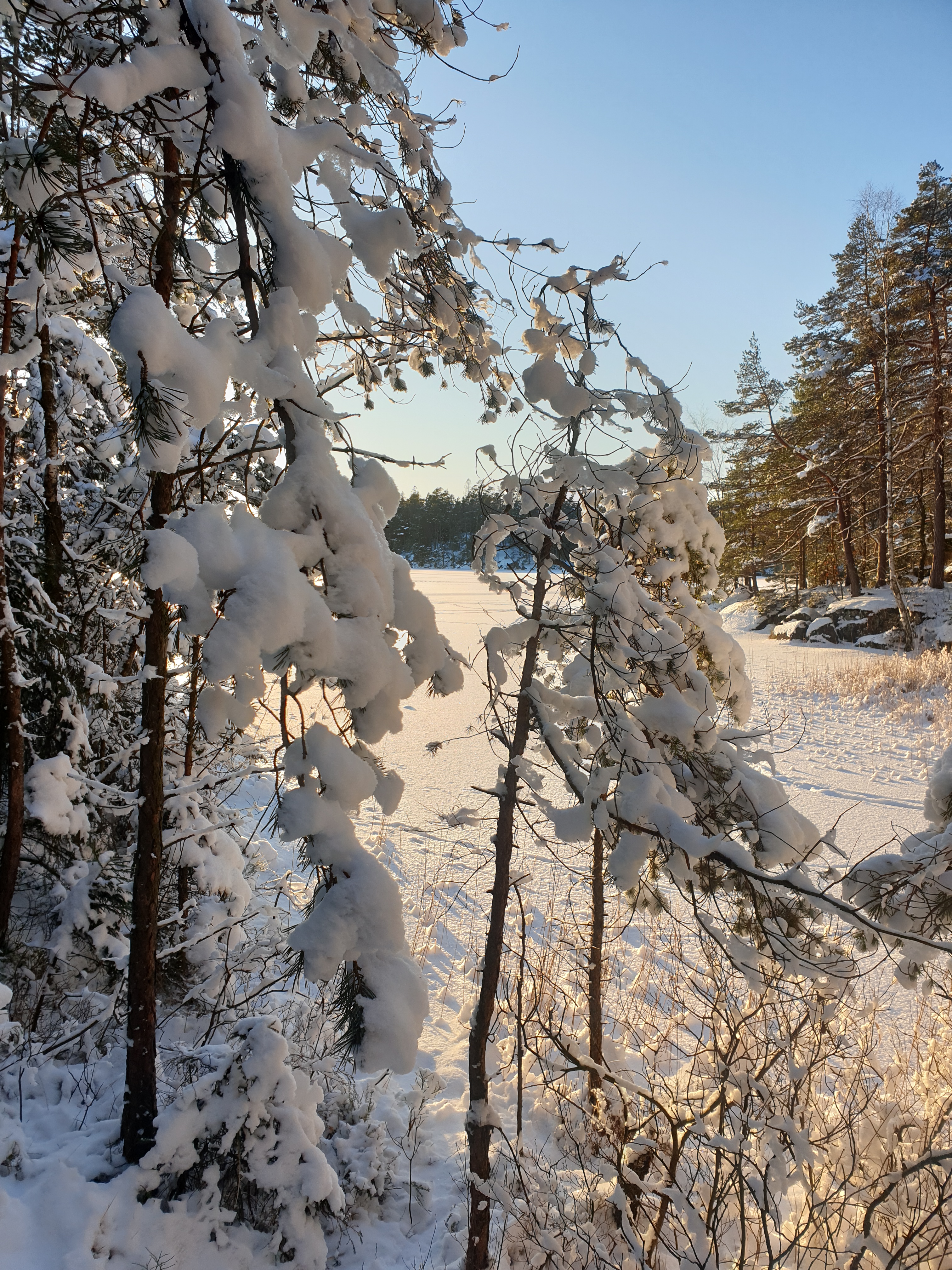 Under gårdagens första promenad fick både Delfi och Femma ha sina Back-on-Track-täcken på sig, och de klarade sig utan några besvär, trots kylan. Till eftermiddagsrundan hade det blivit lite mindre kallt och täcken behövdes inte. Men vi tog en träningsfri dag – jag ville hellre bara njuta av allt det vackra. Skogen och träden med sina snötyngda grenar, sjön och isen med sina spår av djur och människor, solen och snön som gnistrade i densamma.