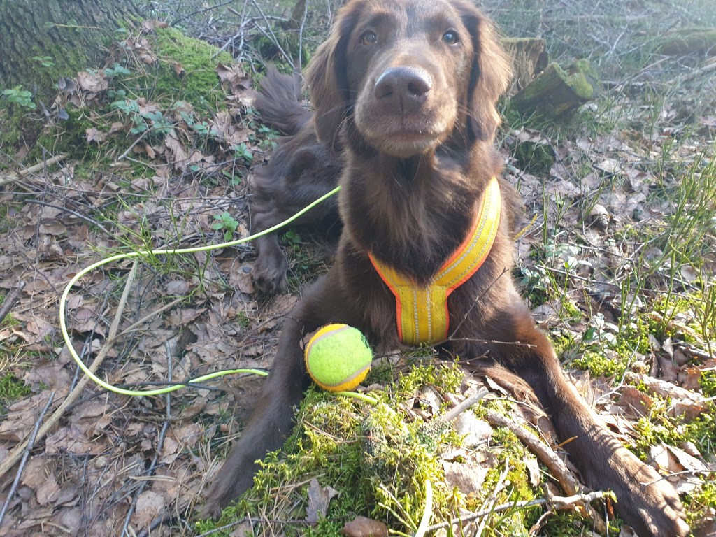 Igår fick båda hundarna varsitt personspår, det var årets första. Delfis spår gick i ”snäll”, hyfsat slät skogsmark, medan Femmas spår gick i oländigare mark. Att jag inte lär mig. Det går väl an att lägga spåret i lugn och ro upp- och nerför klipporna i skogen… Men att hänga med – eller hänga efter…- en supertaggad liten labbe med plötsligt oanade krafter, det blir en ”annan femma”.
