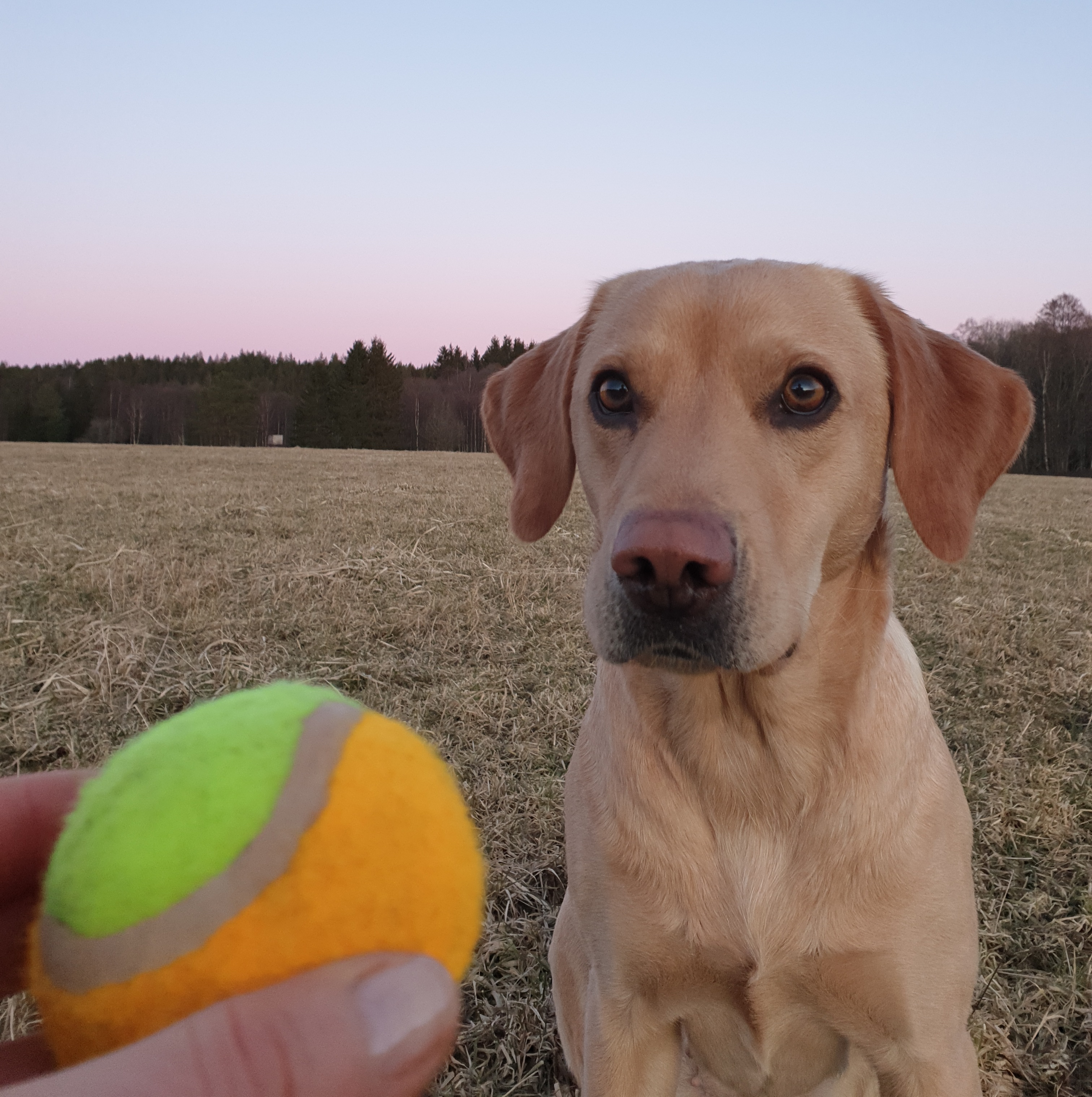 Delfi kommer in med raska steg efter att ha varit ute själv i trädgården och letat upp sin frukost. Jag slänger ut hela hennes portion med foderkulor både morgon och kväll sedan några dagar tillbaka, eftersom hon tyvärr fått ett bakslag igen av hältan, den förbaskade hältan som denna gång startade med de långa promenaderna i snön och fortsatte på grund av att jag startade upp henne för snabbt igen. Nu har hon fått en hel veckas vila med korta koppelpromenader och vi har precis börjat trappa upp lite igen. Hon klarar ändå viloperioderna väldigt bra, men jag vänjer mig aldrig vid känslan av att exkludera en hund på något sätt, och särskilt arbetsnarkomanen Delfi. Jag bara måste få henne frisk igen, för hon är på tok för ung – åtta år – och fräsch för att inte få träna (apportering) mer.