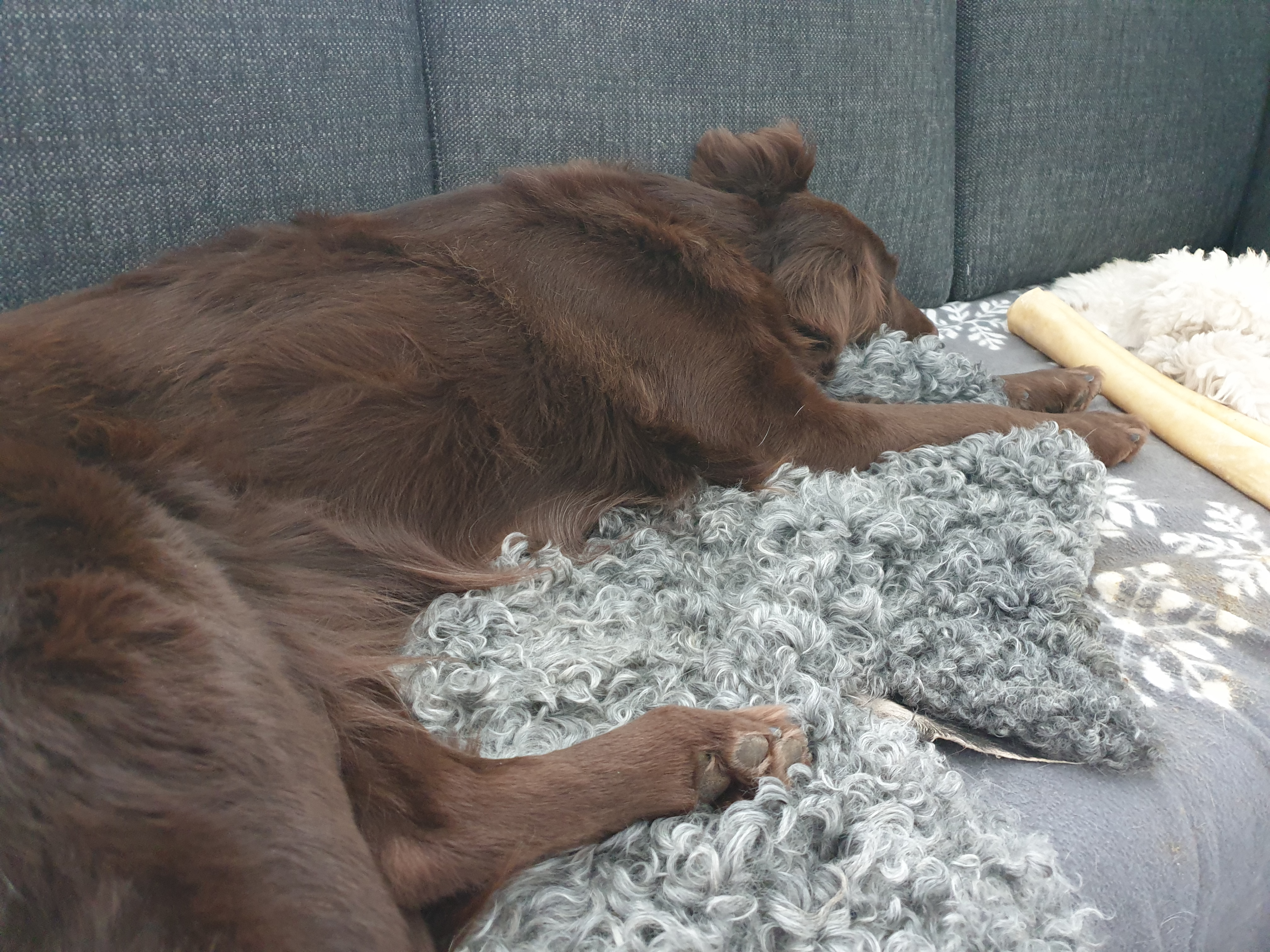 Det snöar på tvären, träningskompisarna har hört av sig och vi är alla överens om att vi ställer in dagens träning. Såvida inte blåsten och nederbörden lugnar ner sig tar nog jag och hundarna en riktig vilodag, även från längre promenader. Delfi misstycker nog inte, för hon vill helst inte lämna sina ”valpar” dessa dagar, skendräktig som hon är. Hon brukar ha 3-4 dagar ca 5 veckor efter varje löp, då hon går omkring och piper, matvägrar och vill ha mer närhet än vanligt. Klart hon får det, och jag har ändå varit extra noga den här gången med att starta upp henne långsamt igen efter koppelvilan, så hon har sluppit längre promenader. Hon har inte ens lika mycket emot att stanna hemma när Femma och jag går iväg, så det passar ju hyfsat bra. Däremot ska ju motion och träning vara bra för att motverka skendräktighet, så hon fick ännu ett personspår häromdagen, ett ängsspår för att ha det i så lätt terräng som möjligt.