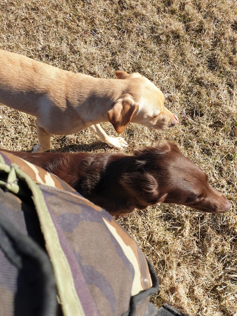 Idag fick jag träna båda hundarna tillsammans igen, som jag har längtat. Vi gick först en ordentlig uppvärmningspromenad, sedan tog jag cykeln själv och åkte till flera olika fält och lade ut fem olika punkter/linjer, två dummies på varje. Cyklade hem, plockade ut hundarna, och så gick vi sansat fot från fält till fält, från linje till linje och plockade in dummy efter dummy, ibland med störningar, ibland utan. Det blev riktigt bra, och tydligen lagom svårt. Femma är just nu något säkrare på linjetagen än Delfi, men så har det också alltid varit det som Delfi och jag haft allra svårast att få till. Jag har verkligen inte hittat ”receptet”, konceptet, strukturen som kunnat ge oss säkerhet i skicken tidigare. Men kanske, kanske är vi på g nu.