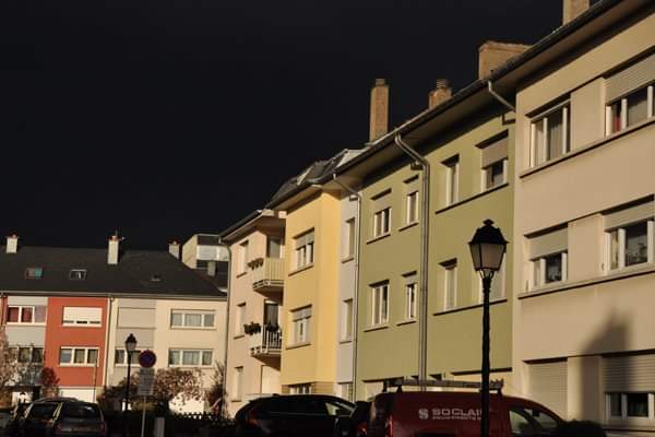När vi kommer hem till vår gata i Howald har det precis slutat regna och jag kan ta ut Saga till närmaste gräsmatta. Det är när vi vänder hemåt igen som solen riktigt bryter igenom, samtidigt som åskvädret ses försvinna bort över taken.
