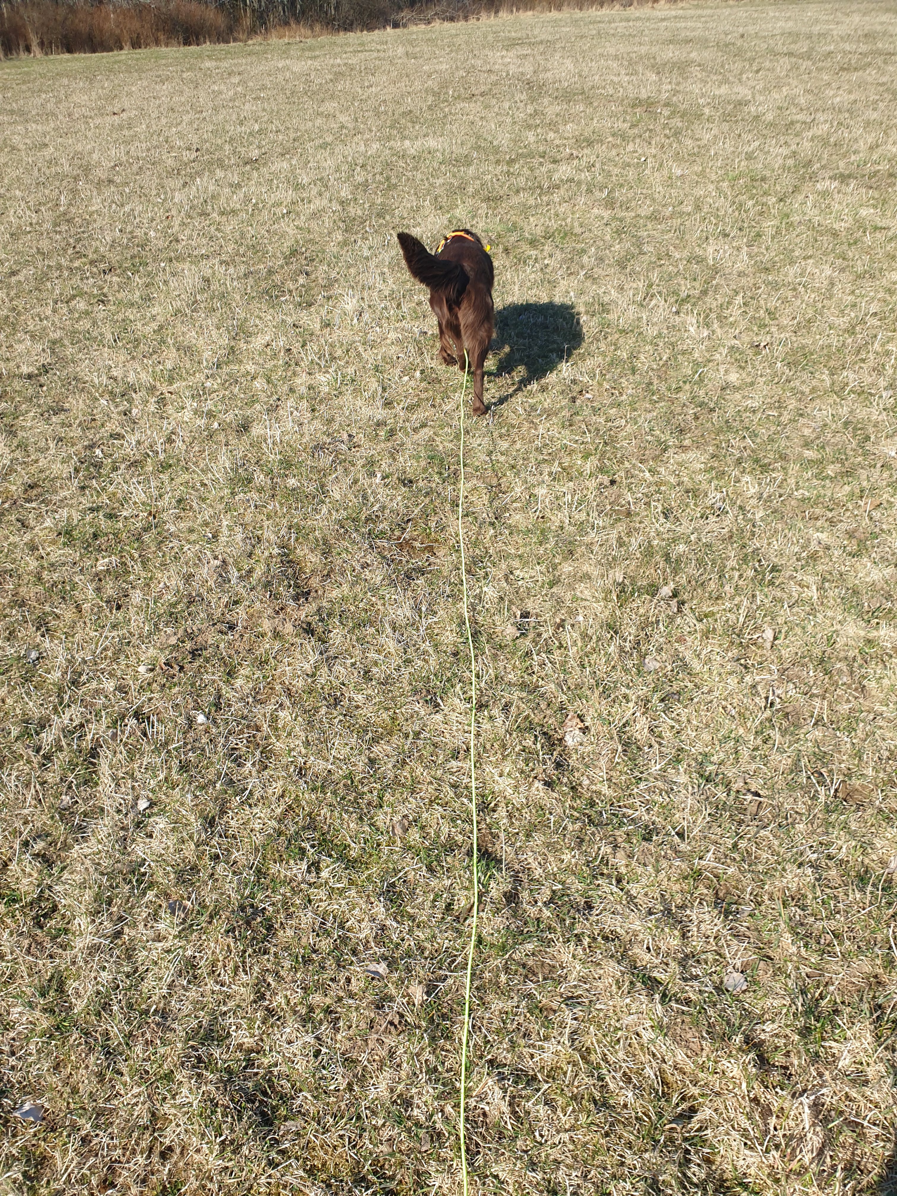 Delfi fick ett ängsspår, och det blev riktigt bra. Tydligen är det jobbigare att spåra i det korta gräset på fältet, än vad det är att spåra i skogen, det märks på hur trött hon blir. I förra veckan råkade jag lägga ett alltför långt ängsspår där hennes ork helt enkelt tog slut – cirka 40 meter före slutpinnen. Det blev en läxa till mig och igår tog hon hela spåret och alla pinnar som låg i det. Hon får tappt i nästan alla vinklar just vid ängsspåren, men ringar sig tillbaka. Och hon blir ju väldigt glad över sin belöning i slutet av spåret: en tennisboll!