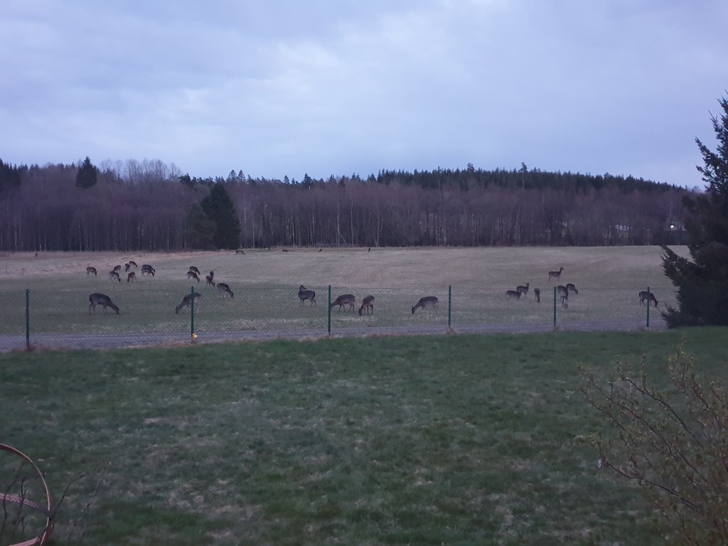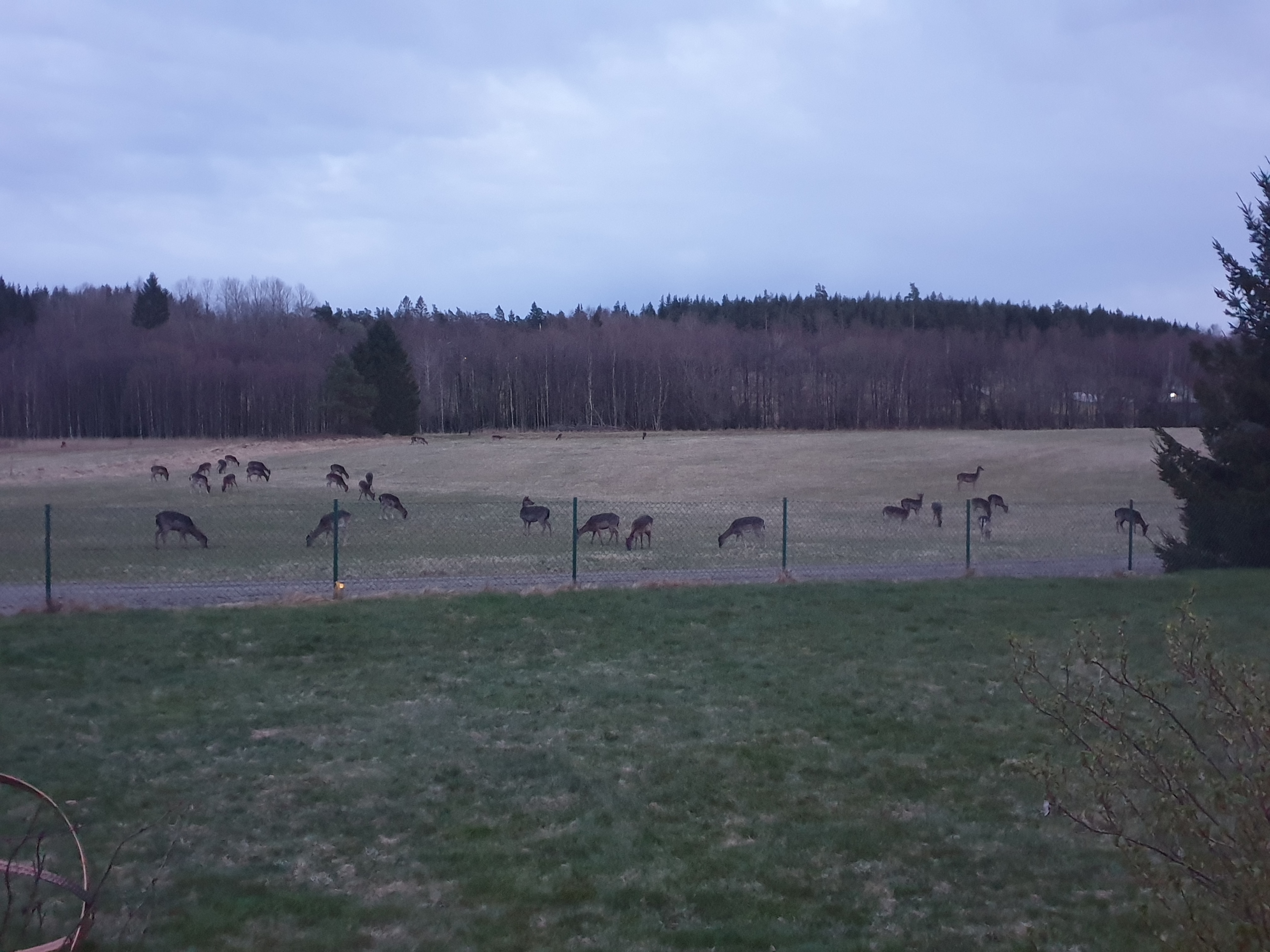 En granne räknade dem till 30, en annan granne som är med i jaktlaget berättade att hjortarna brukar bilda större grupper på våren, för att sedan dela upp sig i mindre grupper igen när de ska få sina småttingar.