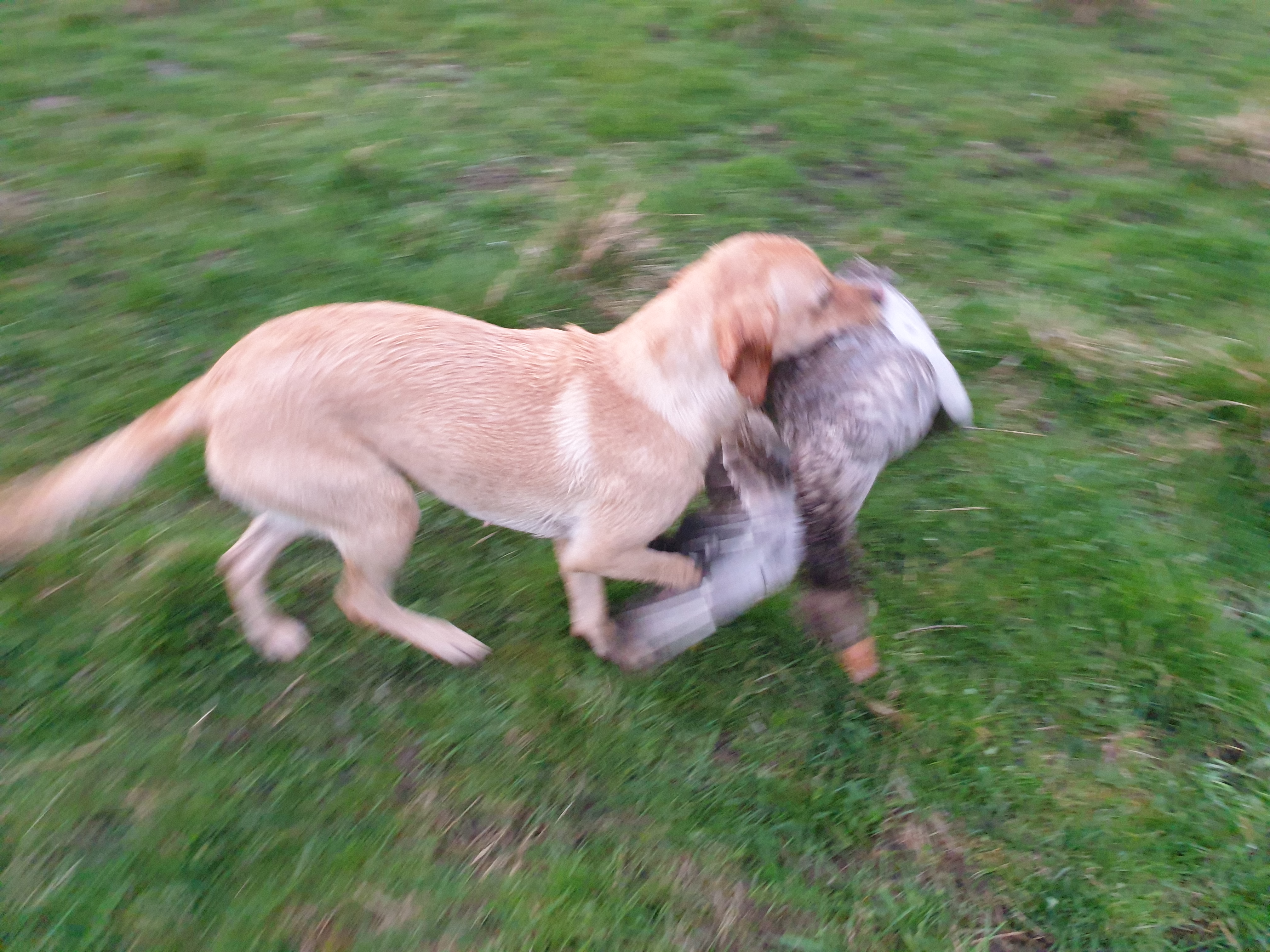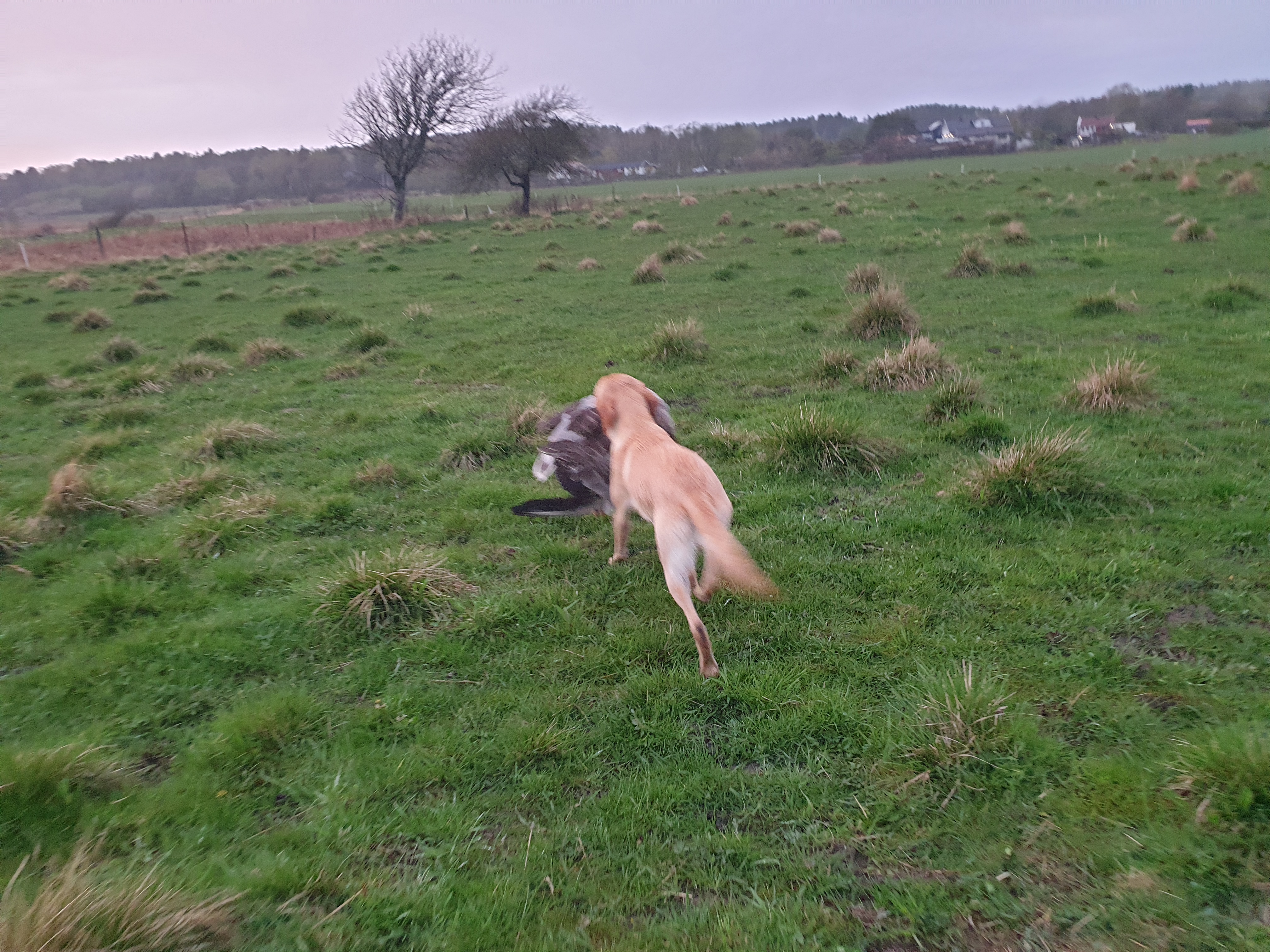 Men efter ett tag fick skytten ner kvällens två första – och kvällens enda – gäss och Femma fick hämta in dem. En av dem låg i den intilliggande ån, och där och då invigde Femma årets badsäsong på riktigt. Lite bråttom var det också, eftersom den döda gåsen annars skulle flyta med strömmen. Lite bökigt att få upp den på land, tyckte hon, men in till mig kom den, liksom den andra. Därefter var det inga sura miner över regnet…! Femma fick en helt annan hållning och var med och spanade efter gäss… som då inte kom, i alla fall inte tillräckligt nära oss. På mitt initiativ bröt vi för kvällen. Jag var redan väldigt nöjd med vad jag sett hos Femma och tyckte att hon fått en riktigt bra erfarenhet med sig. Men nu hade vi väntat tillräckligt, tyckte jag…