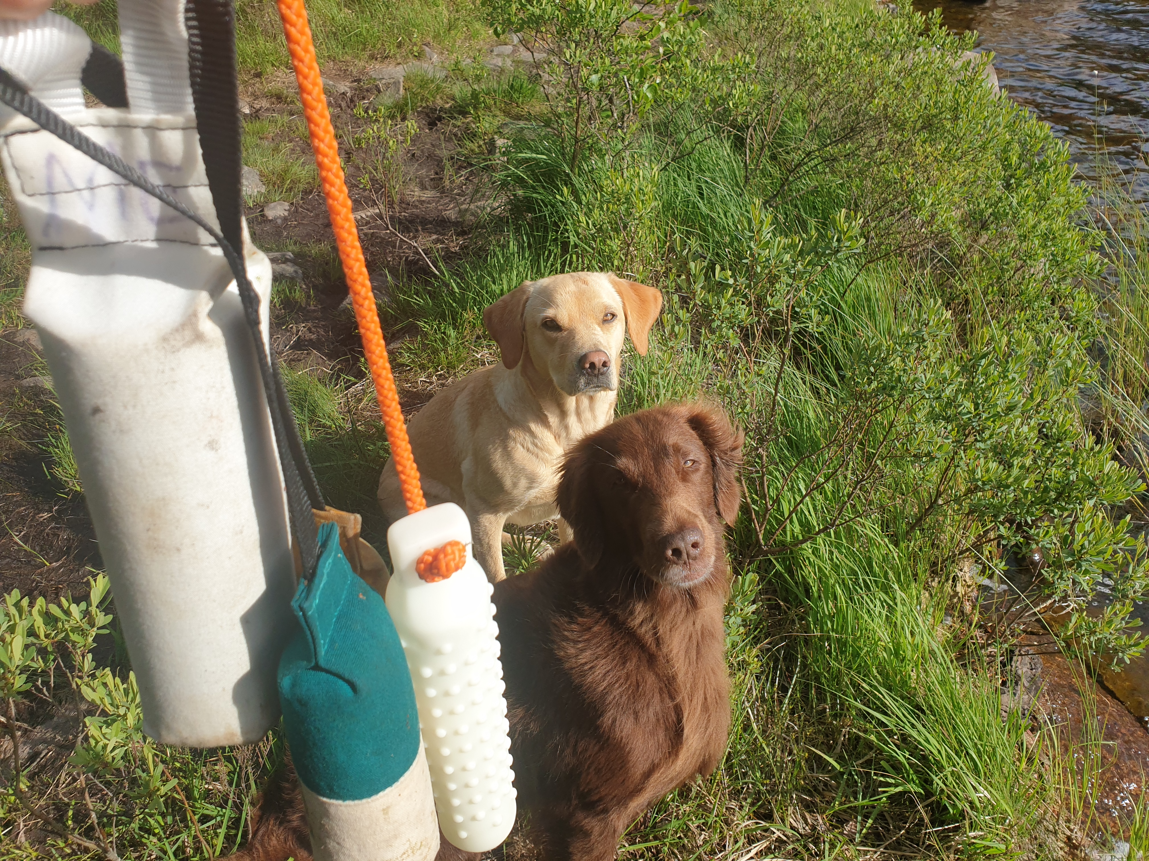 Var det någon som trodde att jag – och Delfi – skulle hålla oss ifrån att köra jaktapportering även på land, när vi nu testat och hennes leder klarat längre promenader i olika terräng plus lite träning…? När sommaren fick ett litet, litet bakslag, vilket betyder bättre träningsväder, nyttjade vi det för jaktträning – på land. Uppvärmningspromenader, sök, teckenträning på fotbollsplan och inte jättelånga skick i högt gräs till gamla målområden. Nejdå, allt gick inte perfekt (inte för Femma heller, för den delen), men attans vad kul det är att få köra Delfi igen, och att få köra två hundar igen – väldigt nyttigt för Femma att få vänta medan Delfi hämtar (och vice versa, såklart). Eftersom jag vet att jag har varit mycket mer noga med Femmas grunder än med Delfis är planen att Delfi ska få gå igenom ungefär samma grundträning parallellt med det andra. Bara för att vi kan!