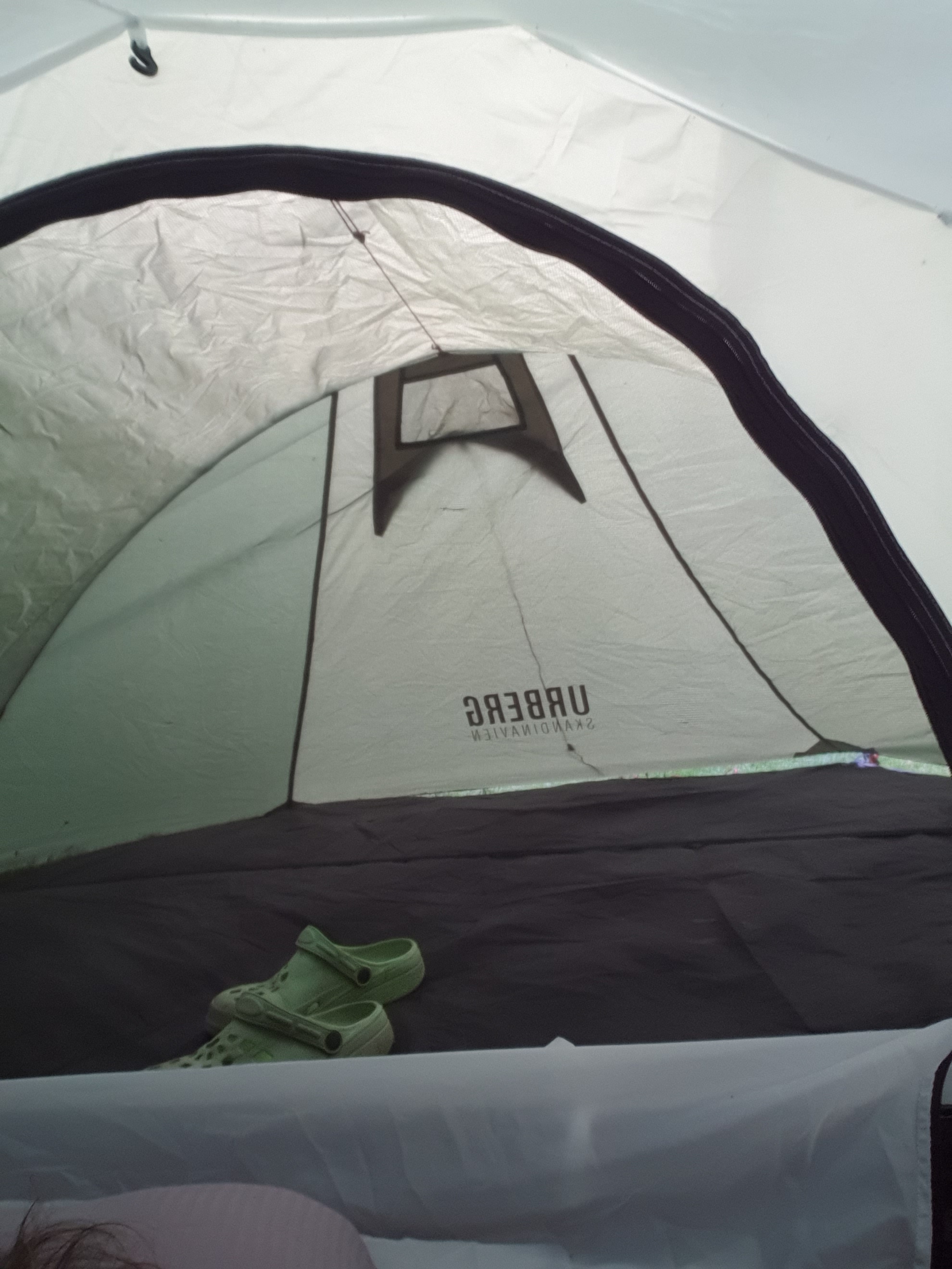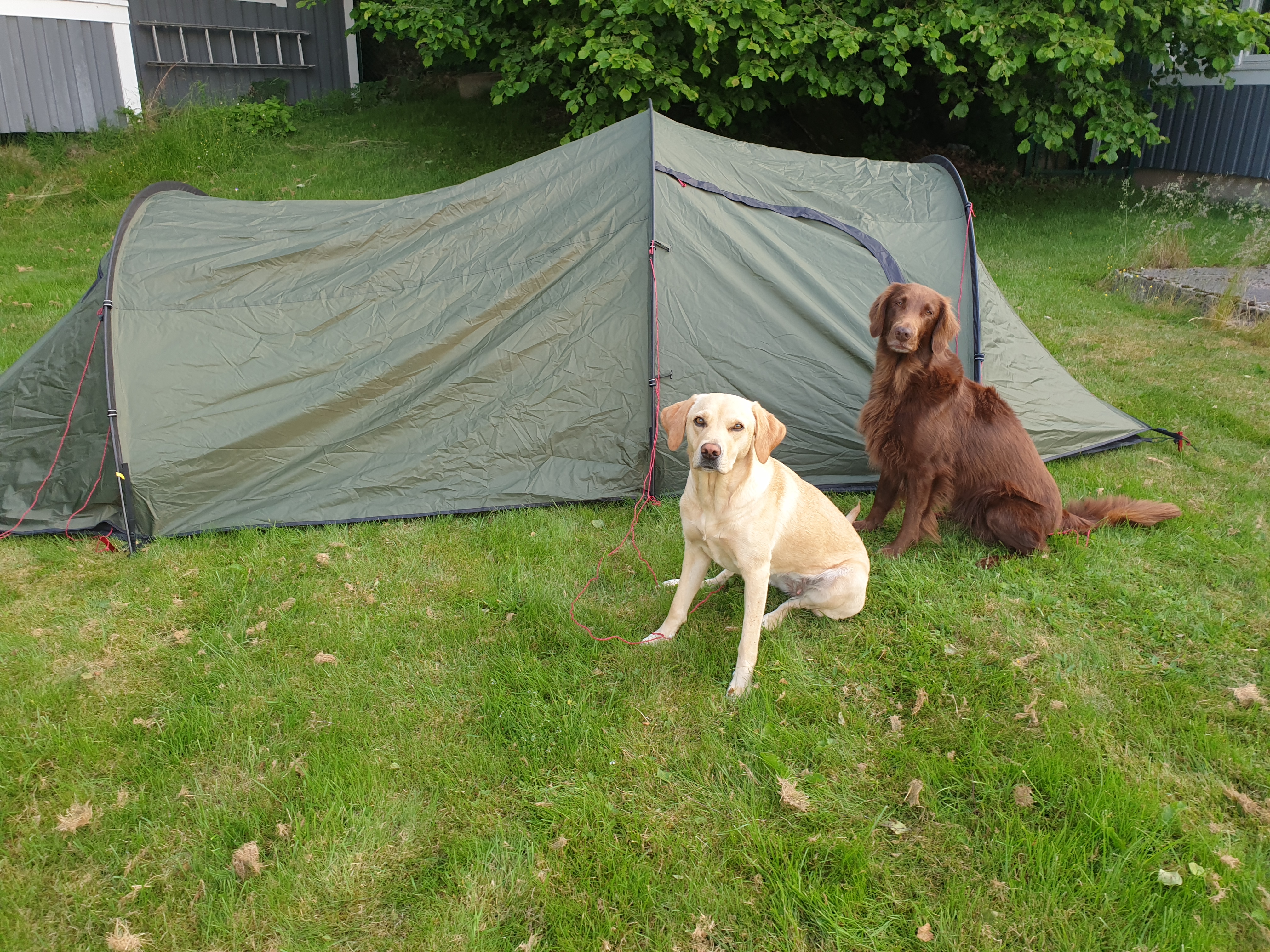 Så jag beslutade snabbt och lätt att slå upp mitt inte alltför välanvända (…) tält i trädgården. På minussidan: jag blev halvt uppäten av knotten på kuppen (när jag sitter och läser har jag en Thermacell som håller knotten borta), särskilt innan jag kom på att dra på mig en hatt med myggnät… På plussidan: det gick fort! På bara en kvart var tältet uppe och strax därefter var det bäddat och klart för hundarna och mig att krypa in och lägga oss. Hög mysfaktor! Och faktiskt fullständigt knott-fritt, tack vare det extra innertältet. Där somnade vi gott.
