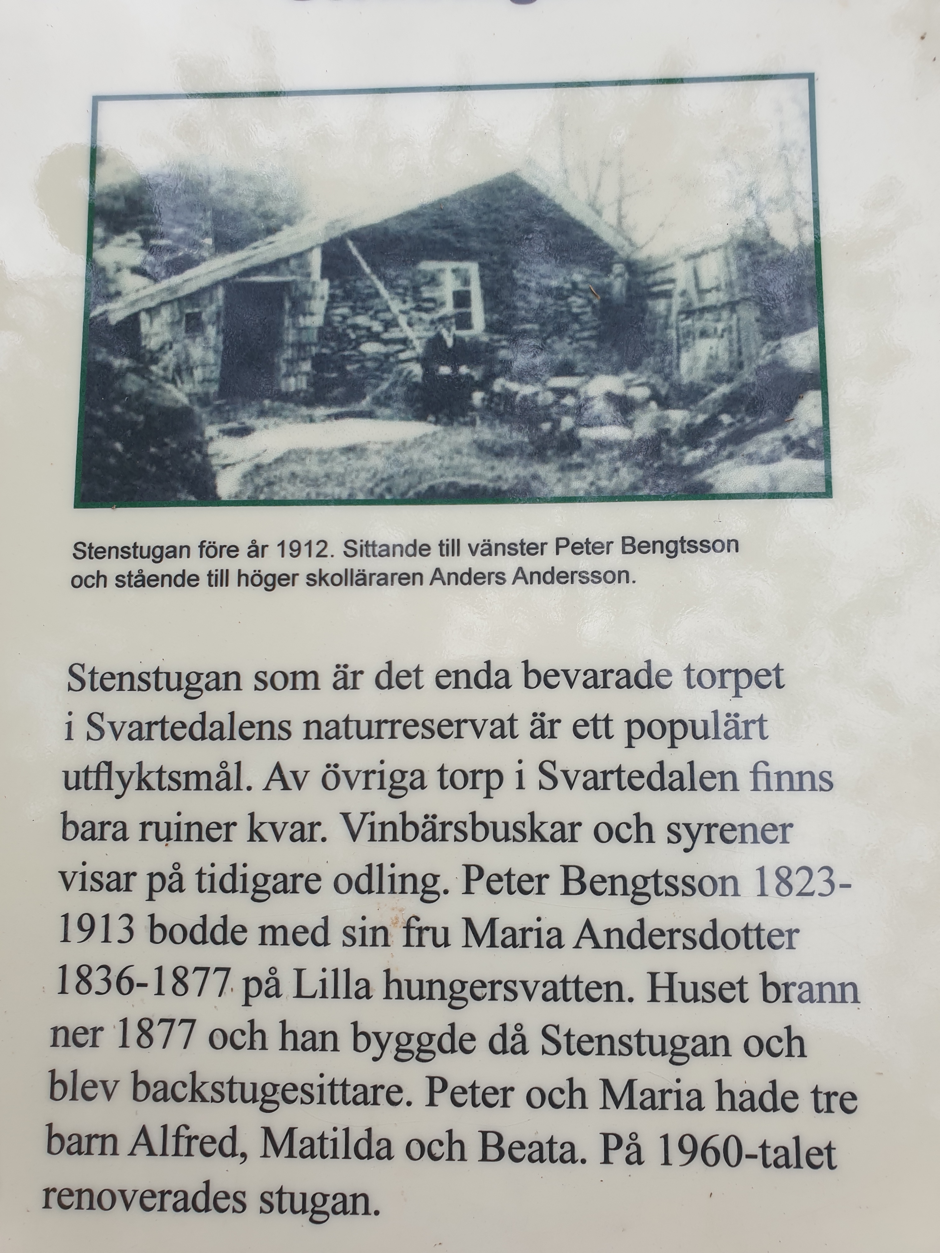 Tisdag: Svartedalen, där jag aldrig varit förut, och där vi först kollade in ett par små sjöar och kollade om de kunde lämpa sig för träning framöver. Det kunde de. Sedan gick vi en 6 km lång runda som var välmarkerad och lätt att följa, men lite småtråkig, bortsett från när vi kom förbi ett riktigt gammalt stenhus med tillhörande informationstavlor. De berättade historien om Peter Bengtsson som bodde när i början av förra seklet.