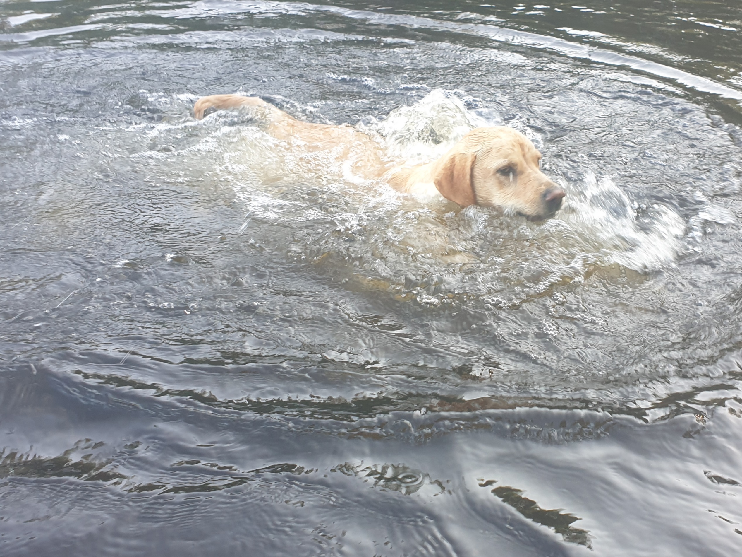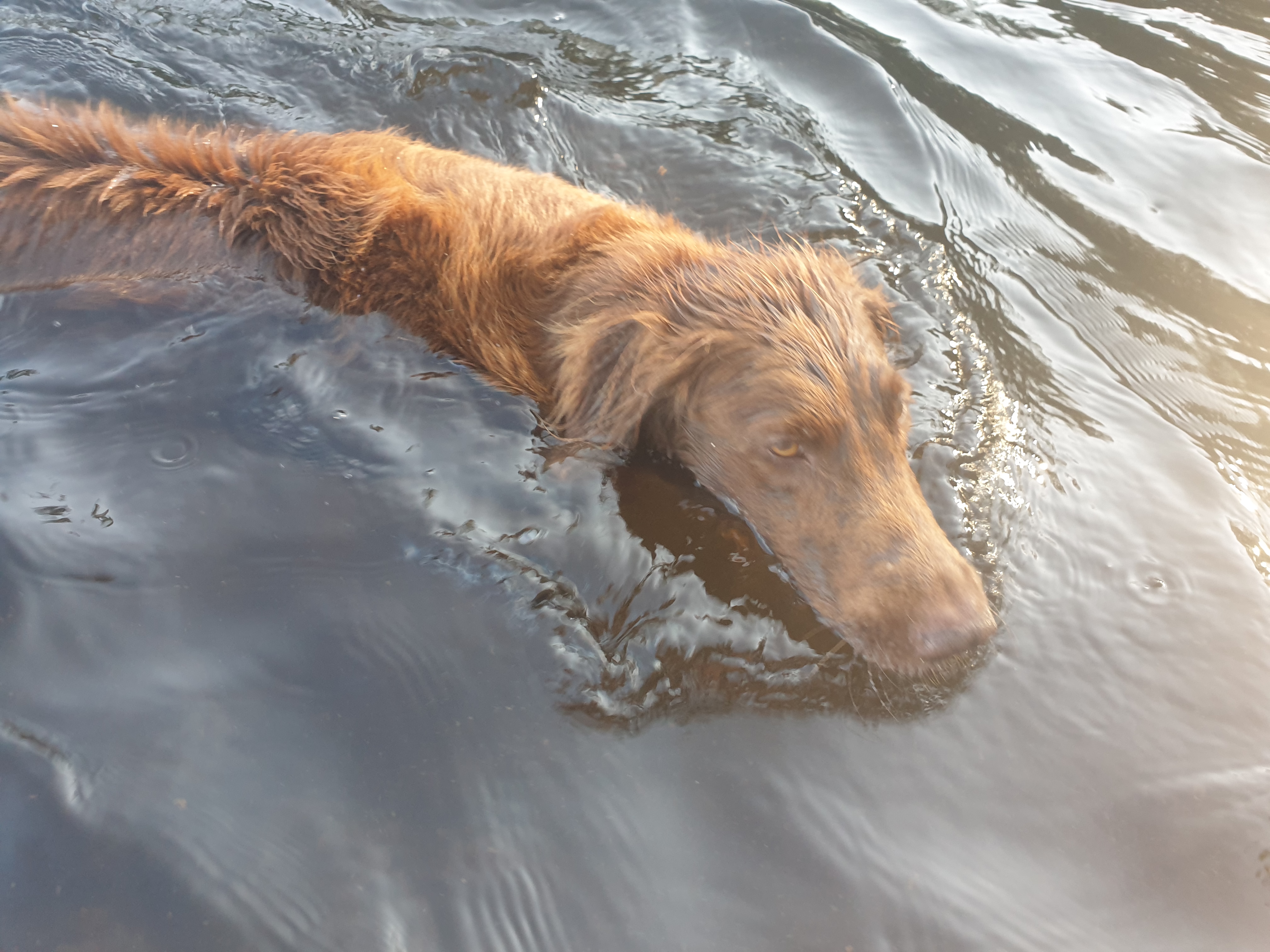 När jag kom hem från pappa idag drog vi genast ner till sjön. Det blev ett träningspass med markeringar och dirigeringar i vattnet, och därefter simning och bad-och-plask.