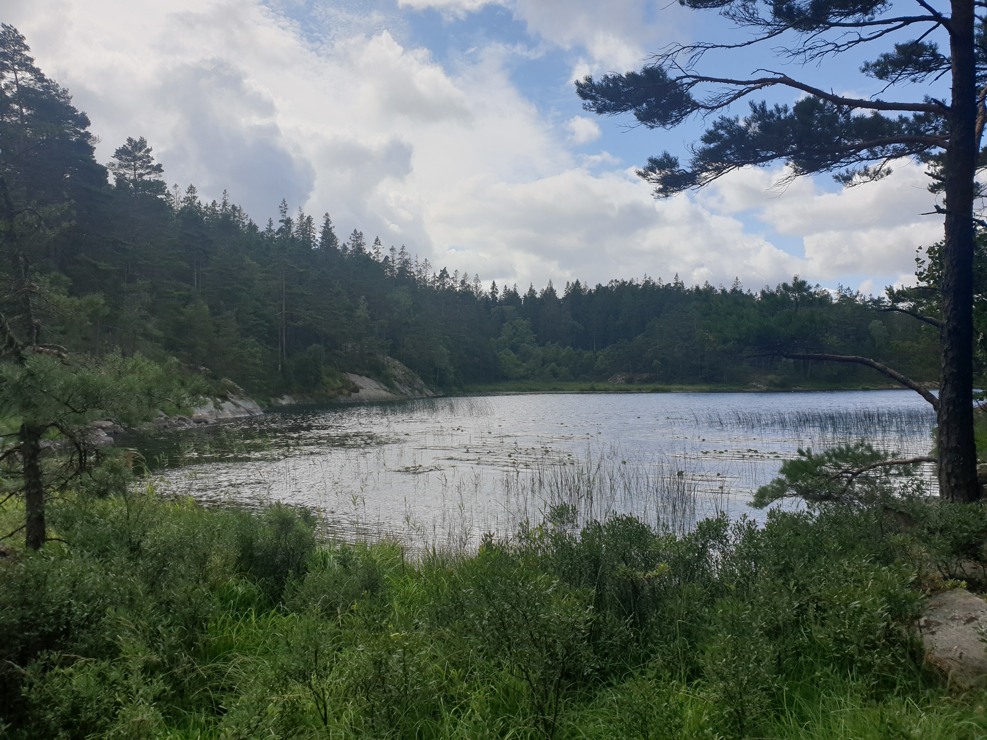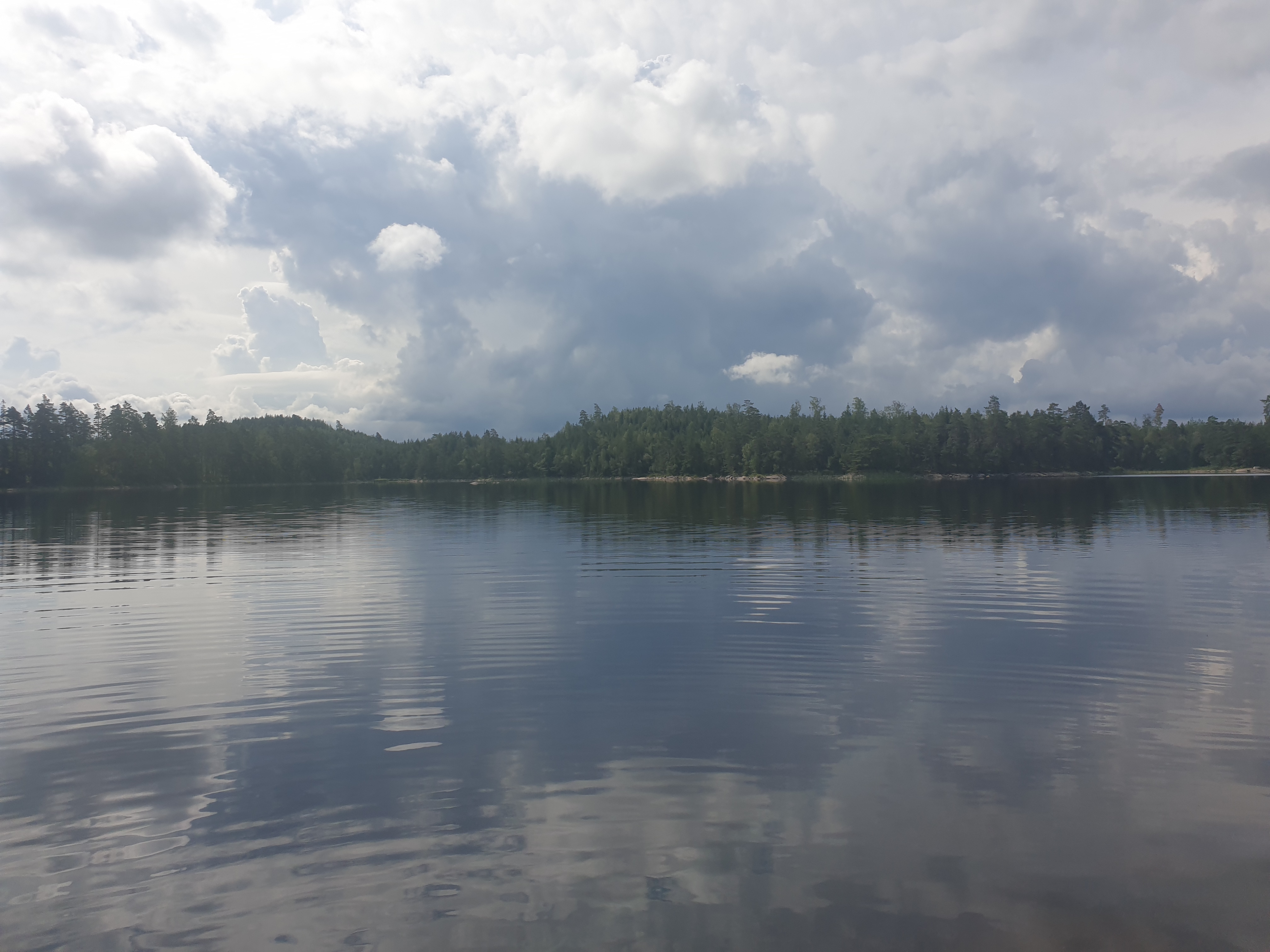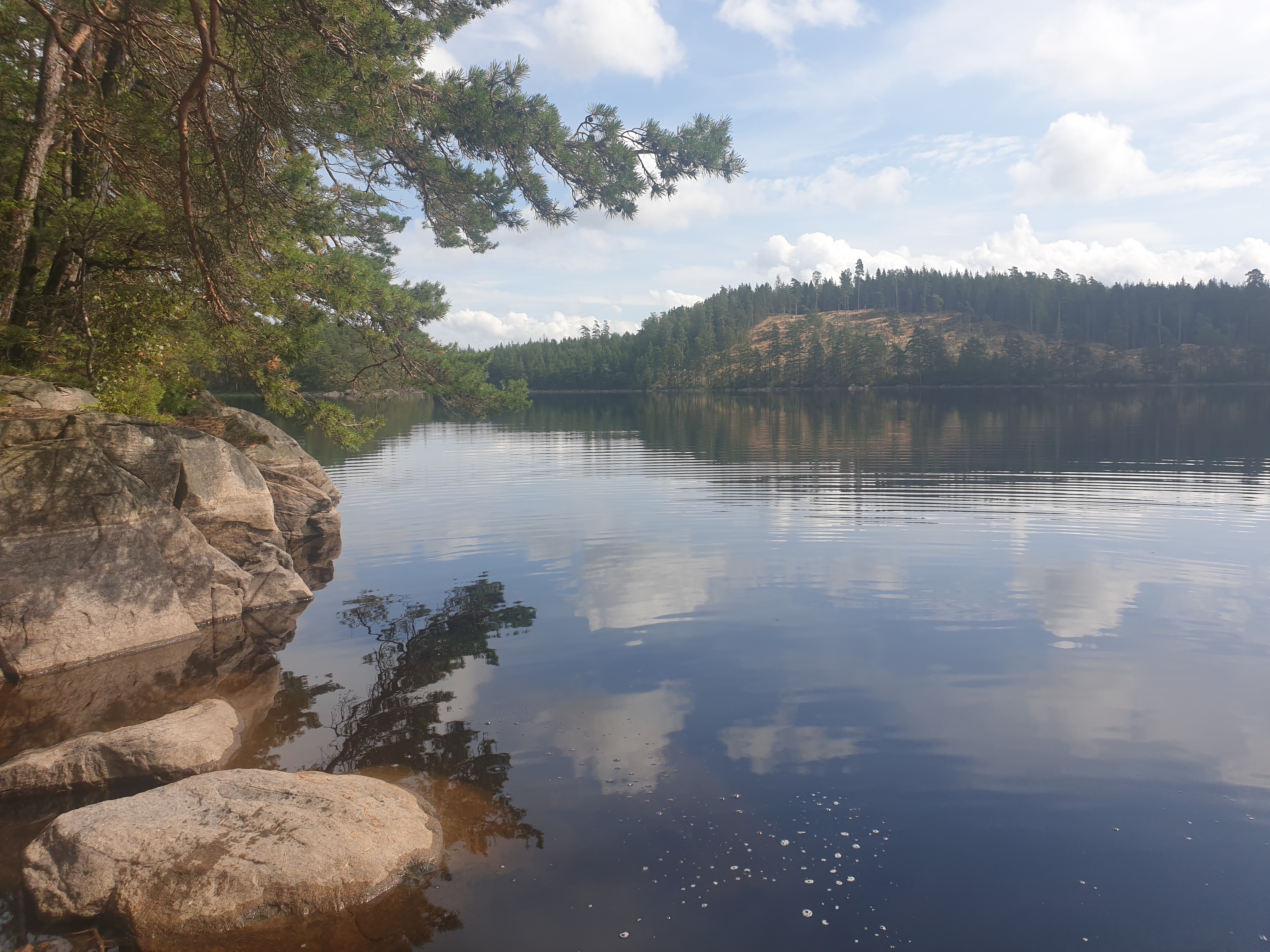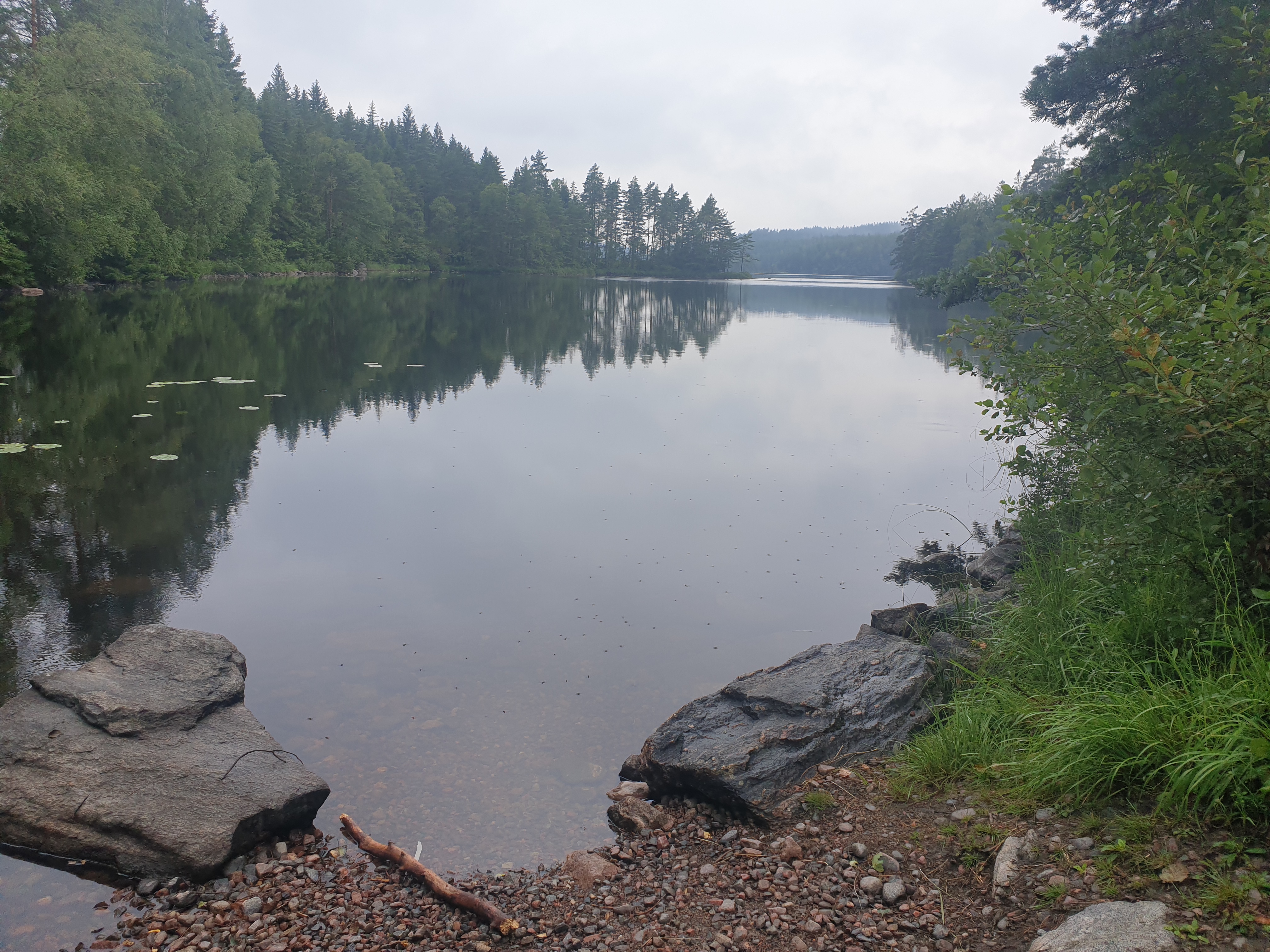 Men så hade vi varit en liten bit in i Risveden för träning, och tog en ny väg hem, och åkte då förbi en sjö som jag stött på för ett tiotal år sedan, när jag hyrde sommarstuga på ett helt annat ställe i Risveden. Jag blev riktigt förvånad över att samma sjö låg längs denna väg, men när jag kom hem plockade jag fram min stora Risveden-karta, och mycket riktigt: med bil var jag långt ifrån, men fågelvägen var det ganska nära den där stugan jag hyrde för några år sedan. Lusten att utforska lite mer hade väckts!