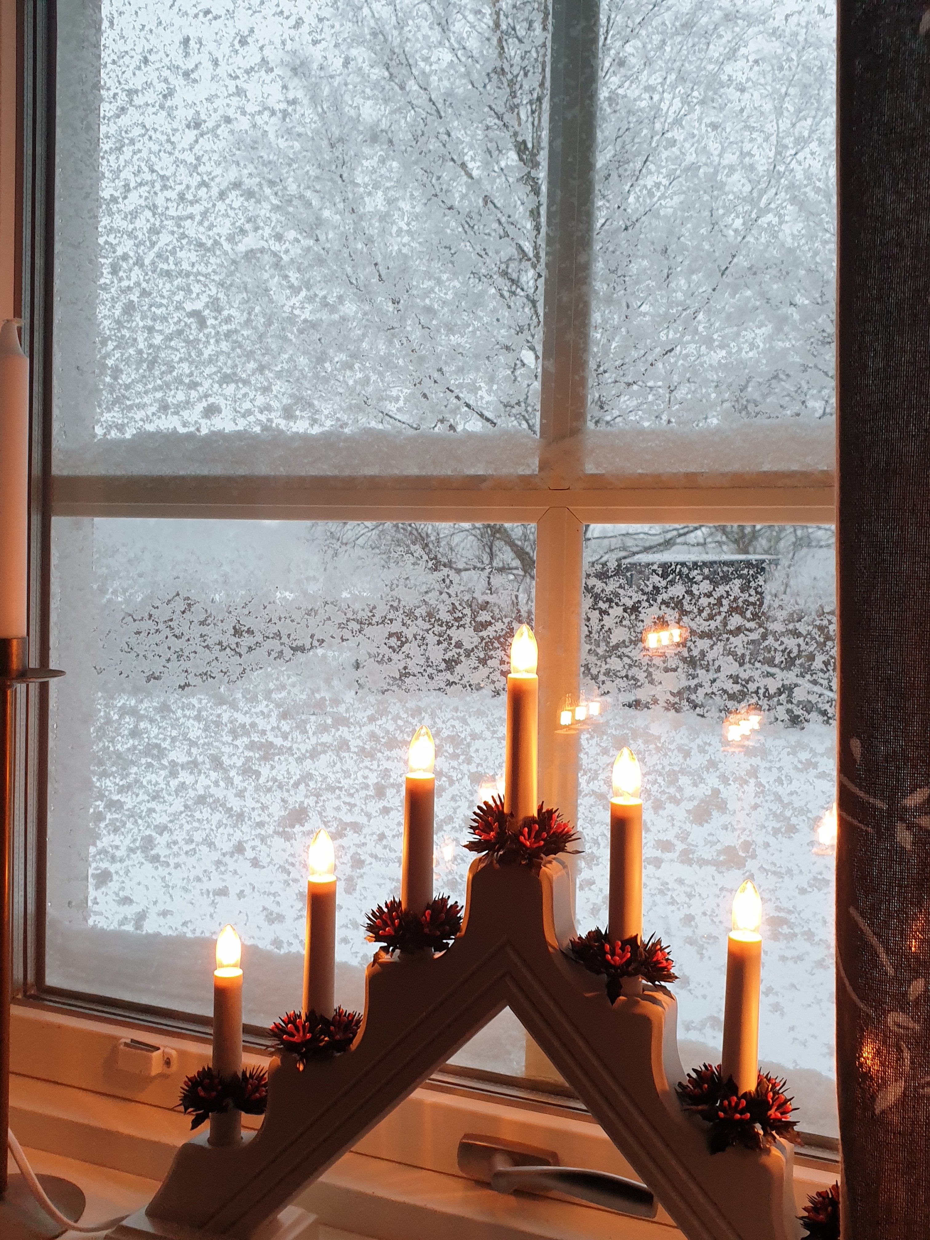 Visst gör sig julpyntet så mycket bättre i snö! Faktum är att jag bara natten innan hade övervägt att strunta i julpyntet inomhus i år, men nu åkte allt fram: alla röda dukar, tomtar, halmbonader osv…