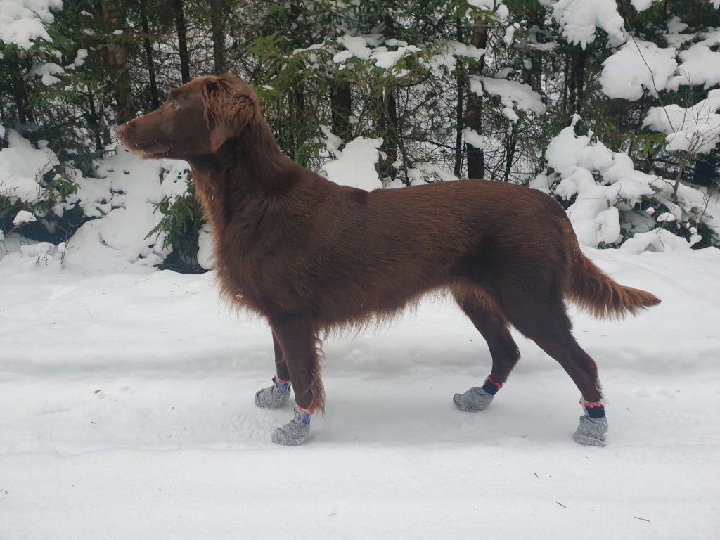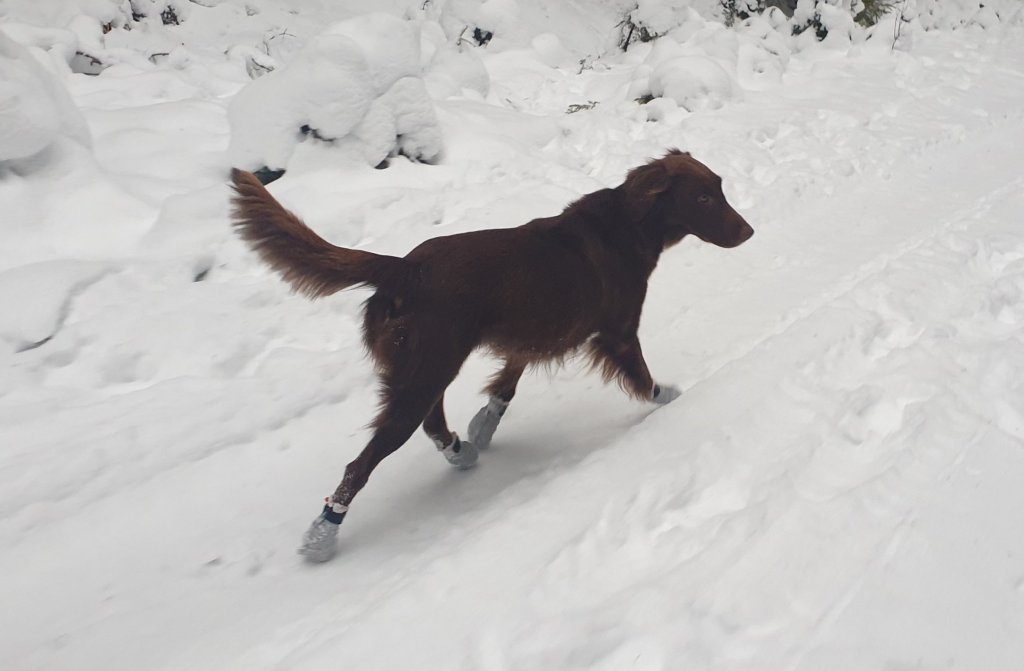 Delfi fick sockor att ha på sig när den lösa snön bildade isklumpar under tassarna.