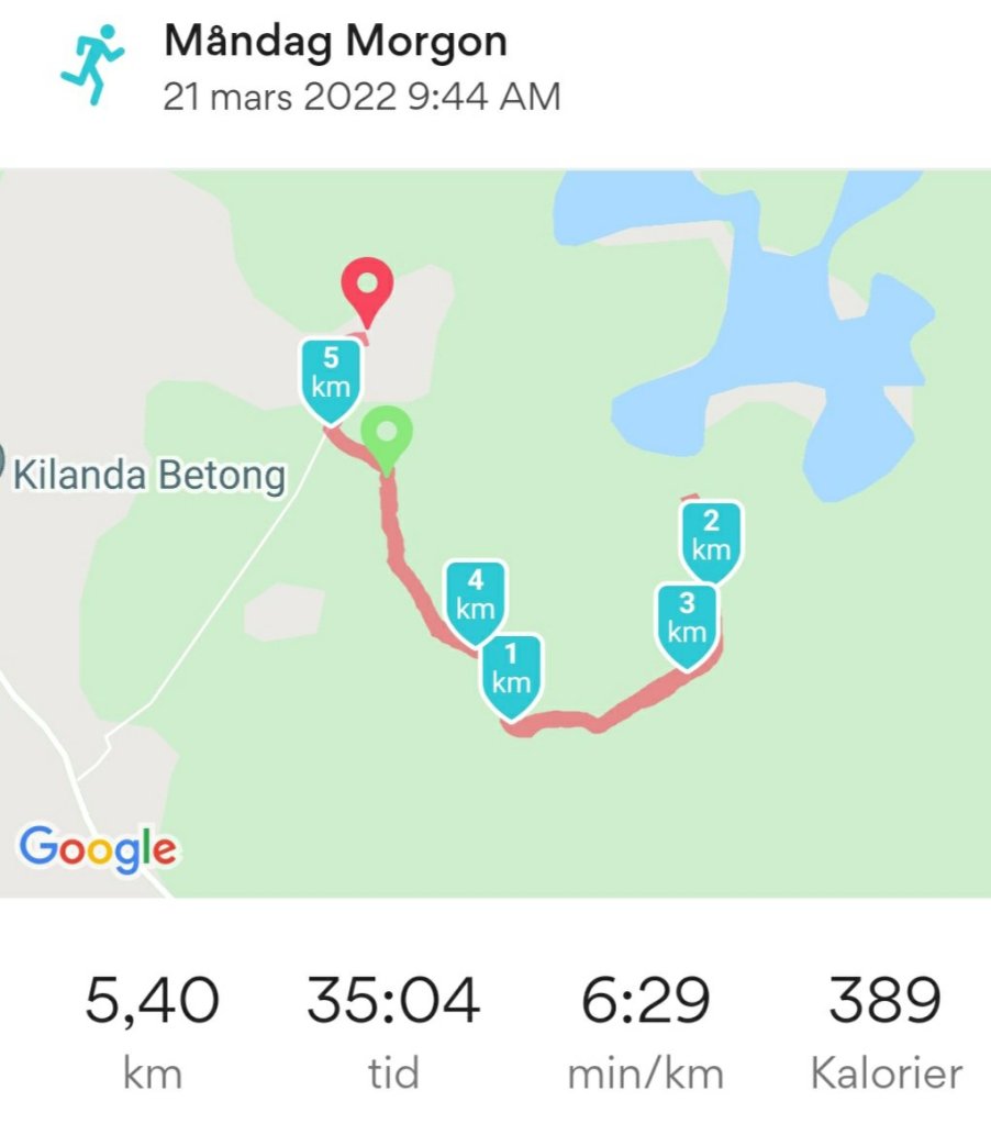 Nu springer jag alltså 5,4 km på 35 minuter. Enligt ”nätet” bör man springa 5 km på 30 minuter för att kunna känna sig någorlunda nöjd (även om jag är rätt nöjd, faktiskt, men kan ju bli ännu nöjdare), så jag behöver komma ner till 6 min./km i snitt – sedan ska jag utöka sträckan så smått.