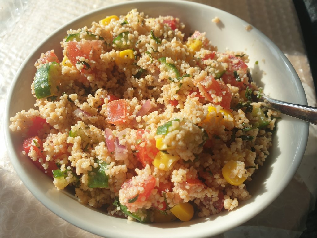 Mat-tipset är en gammal favorit från Luxemburg som jag nyss plockat upp igen: tabbouleh, marockansk dito. Jag vet att det finns varianter med bulgur och massor med persilja, men det här receptet är det som mest liknar den tabbouleh som man kunde köpa färdig – med eller utan kycklingbitar i – i Lux. Helt perfekt att ta med sig på utflykter eller som lunch när som helst. Jag använde fullkornscouscous (jag använder numera nästan bara fullkornsris, fullkornspasta etc.) och utöver övriga grönsaker lade jag till gurka och majskorn. Glöm inte salt och peppar, sedan behövs inget mer. Jättegott till en bit grillad kyckling.