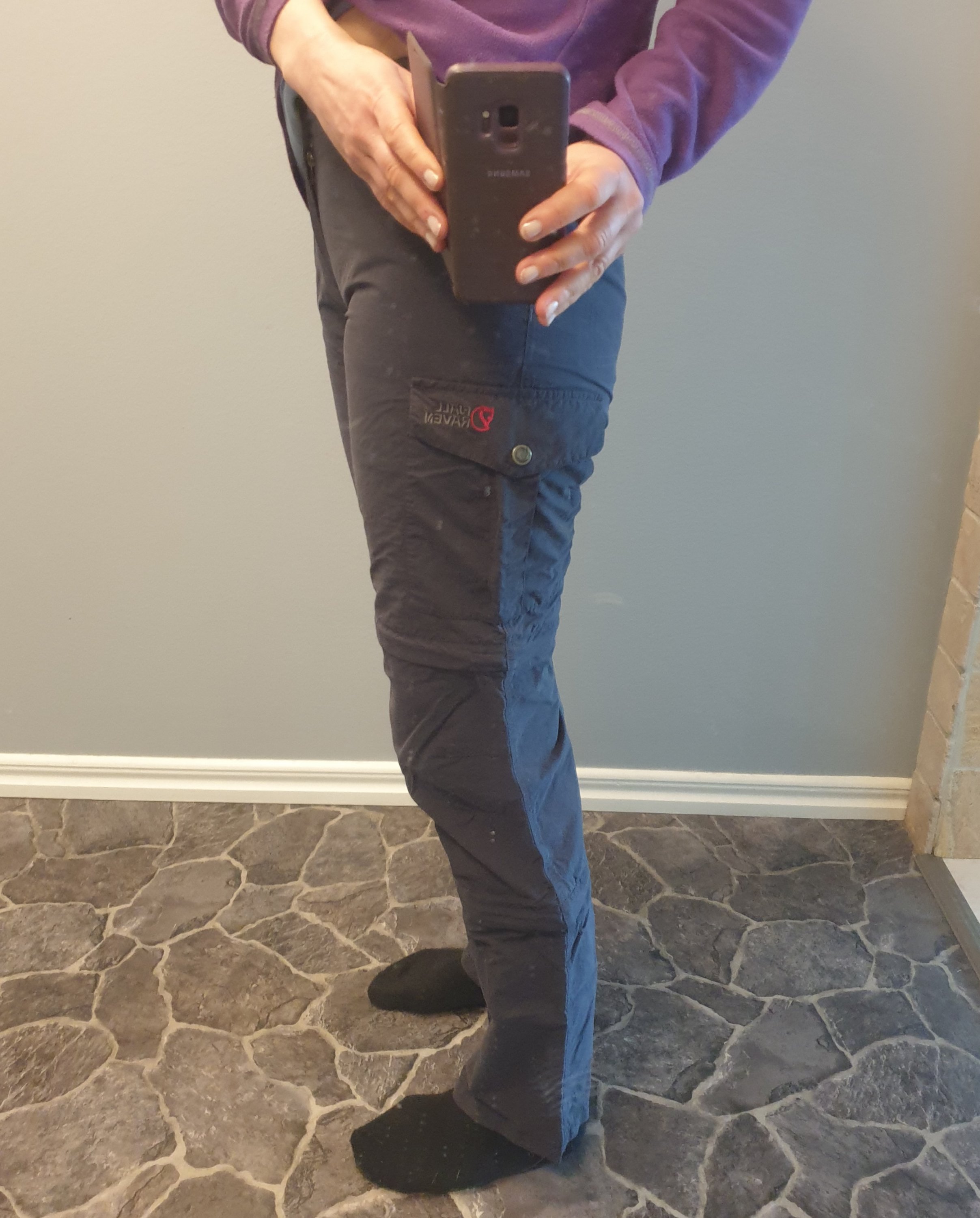 Det sägs ju att plagg som man inte använt de senaste två åren ska man rensa ut – och jag har försökt, i alla fall med en Fjällrävenbyxa som jag köpte i slutet av sommaren 2008 (eller 2009). Det var min favoritmodell som jag just hade slitit ut ett par av, och jag ville ha ett par nya som väntade till följande säsong. Tvättade dem och fick benen upplagda som man alltid måste göra med den byxmodellen. Det var bara det att jag hade gått ner i vikt den sommaren, och när nästa säsong kom så kom jag inte längre i de sprillans nya byxorna – och har inte kommit i dem sedan dess. Jag har försökt sälja dem, både i någon köp-och-säljgrupp på Fejjan och i butik (de tog inte emot dem). Har haft dem liggande i bilen i månader ifall jag skulle träffa någon att fråga (men glömde alltid bort att fråga…) Och nu kommer jag i dem igen. Så jag sätter upp ett par Fjällräven-byxor, helt oanvända, men upplagda och klara, på listan över min nygamla garderob.