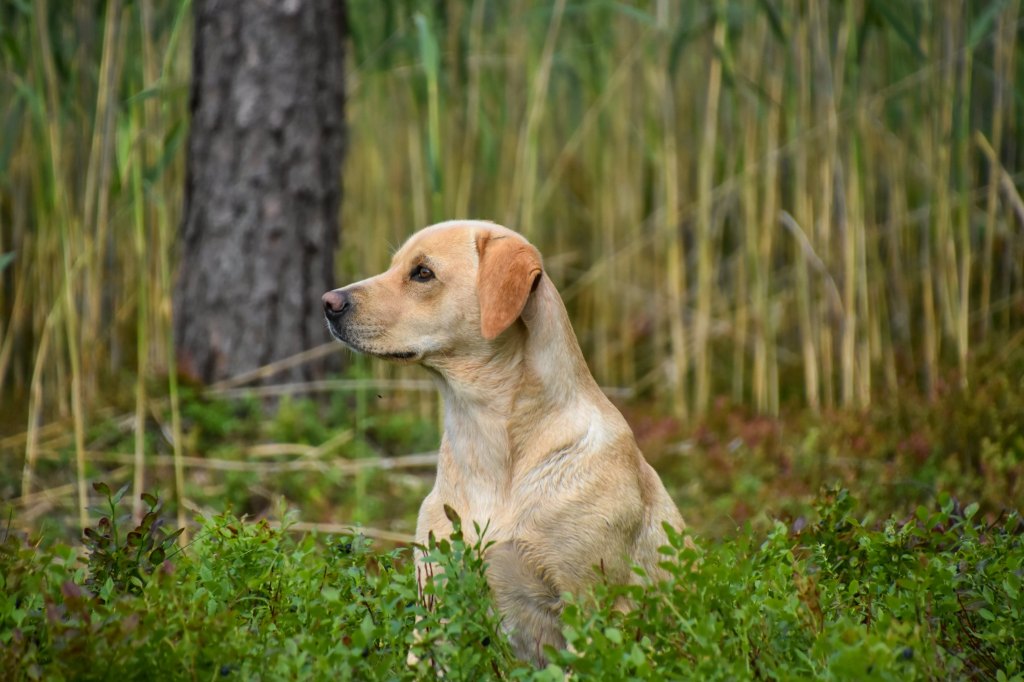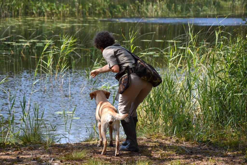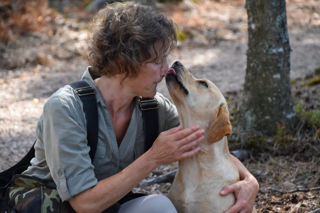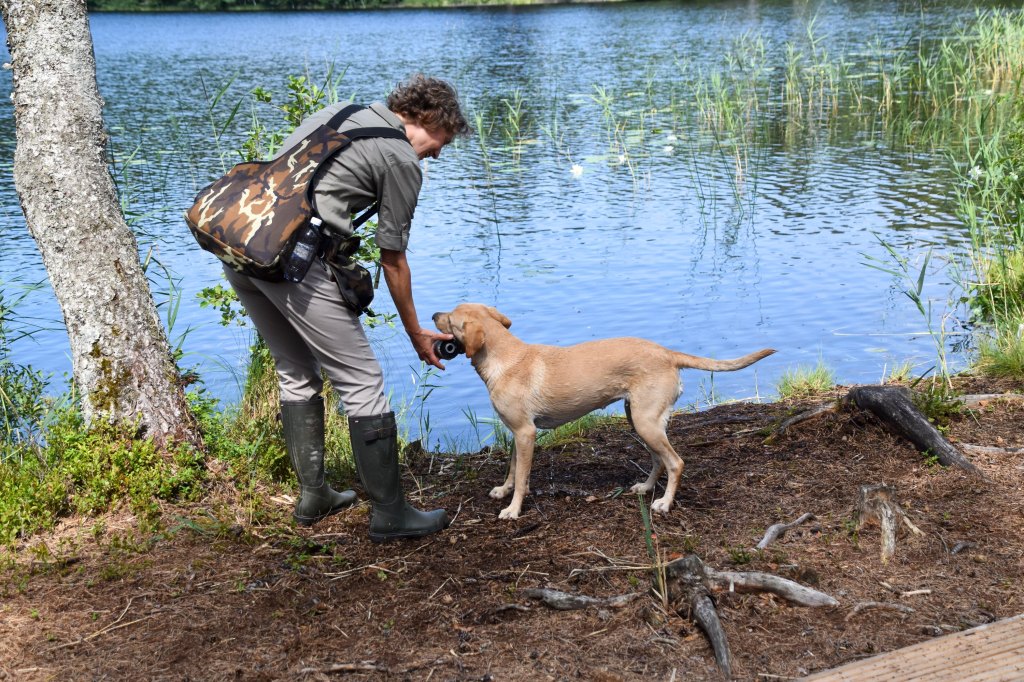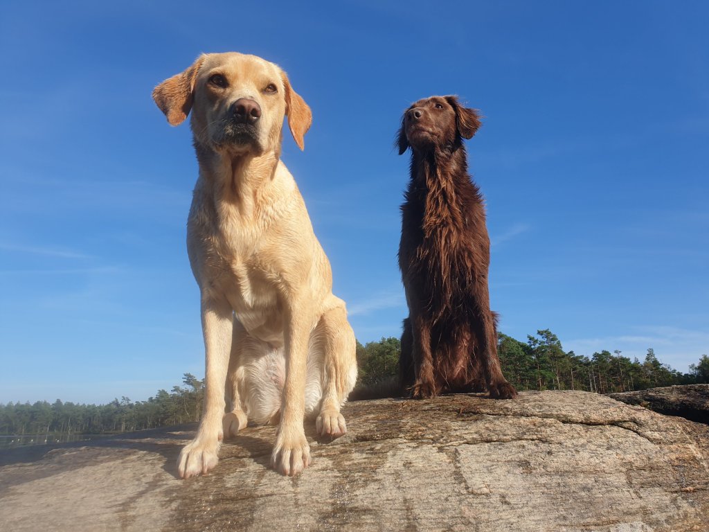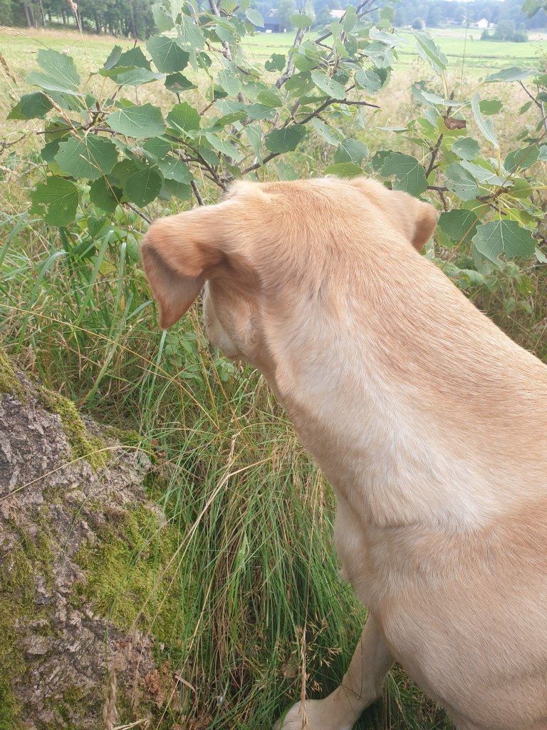 Det blev i alla fall en väldigt trivsam liten jakt, där vi satt på pass två-tre timmar, och det sköts totalt ca 10 fåglar; några duvor och två gäss, varav en riktig bamsing till kanadagås. När Femma hittade den blev hon alldeles ”nämen den här kommer jag ju inte att kunna bära, no way, matte, kom hit och titta själv, den är ju gigantisk!” Men jag gick lite närmare och uppmuntrade henne att i alla fall försöka, och då hittade hon ett grepp om nacken på fågeln som funkade och hon kom väldigt stolt bärandes på den… viftandes på hela den lilla labbekroppen. Guldstjärna!
