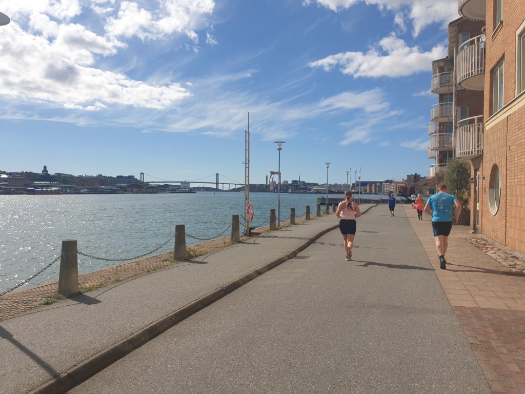 Starten gick kl. 14, strax utanför Eriksbergshallen, och slingrade sig genom de (inte längre så) nya bostadsområdena på norra Älvstranden, förbi gamla hamnbassänger, bort till Lindholmen och sedan i stort sett längs kajen tillbaka till Eriksberg, två varv. Här och där stod funkisar eller publik och hejade fram oss, och det var verkligen kul och peppande. Ännu bättre var det att springa förbi de ställen där det spelades dansmusik i stora högtalare – då fick jag lust att dansa fram, oavsett hur trött jag var.