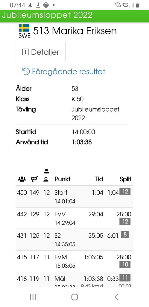 Så småningom kom resultatet från loppet, och jag hade sprungit på lite drygt en timme, helt enligt plan, alltså. Väldigt nöjd med detta, då det gäller som ”seedande” för kommande lopp, exempelvis om man skulle få för sig att springa Göteborgsvarvet, eller så… Då slipper man starta allra längst bak i fältet (som man annars gör när man springer för första gången) och kanske missa peppningen från publik och musikstationer…