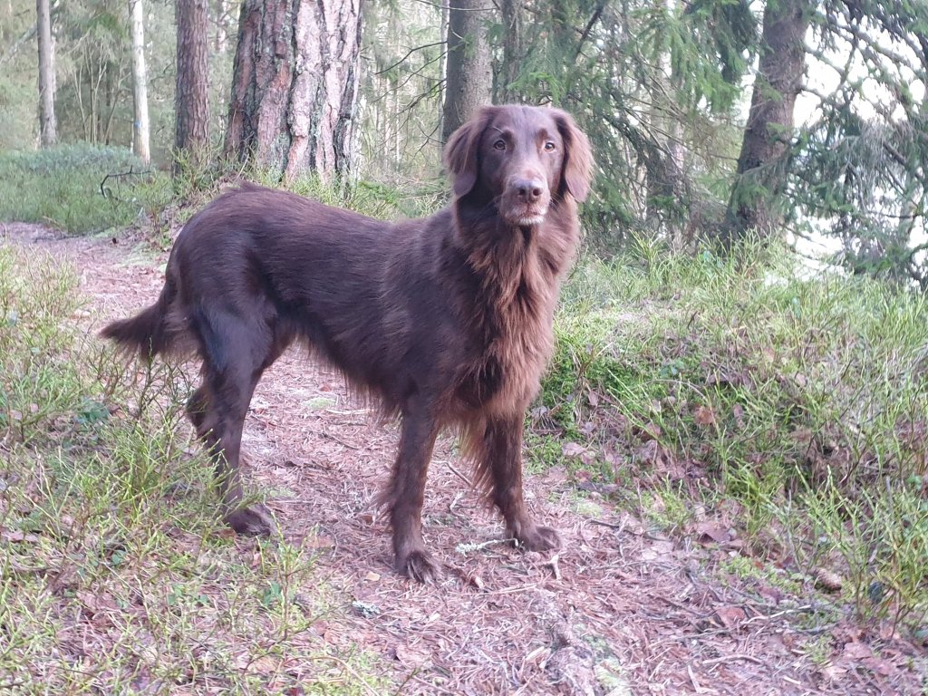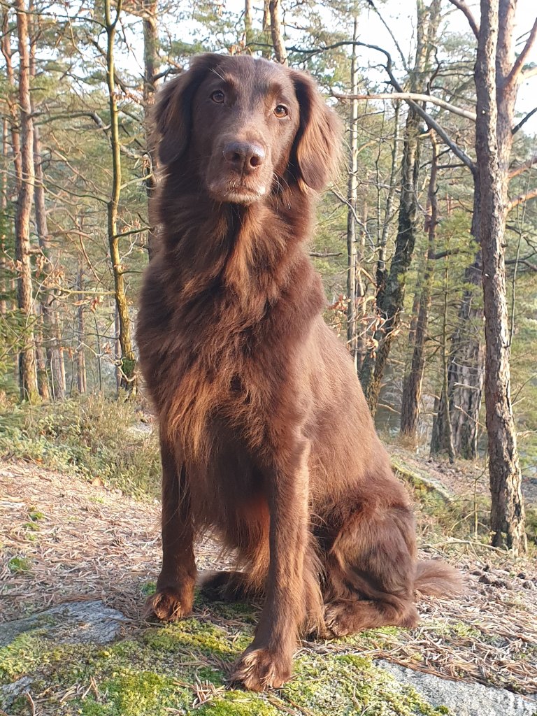 Hon är alldeles lagom smäcker och fin för en tio-årig sport-flatte och har blivit en riktig mysig flatte-tant. Stanna hos mig länge, finaste Delfi.
