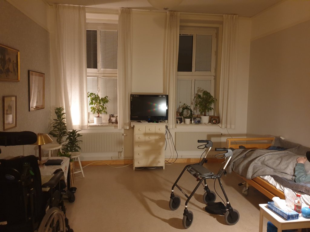 På korttidsboendet fick han också introduceras i något han inte varit med om på länge, nämligen att träffa flera andra människor som han åt tre dagliga måltider ihop med. Anhöriga fick inte vara med under måltiderna, men vad jag kunde se var det inte fråga om några sociala tillställningar, direkt, men ändå fullt tillräckligt för pappa som levt ensam så länge. Under de sista veckorna av hans vistelse där började det gå vinterkräksjuka och influensa, så det blev mindre av de gemensamma måltiderna av den anledningen. Pappa klarade sig i alla fall från smitta, vilket var huvudsaken.