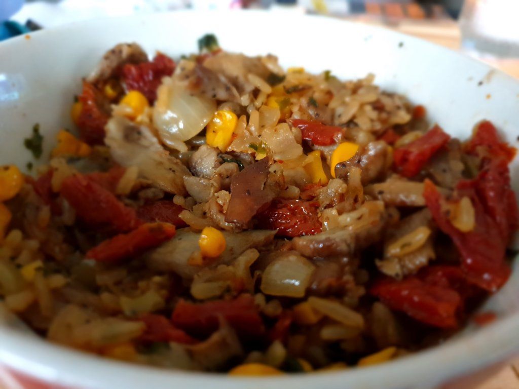 Sedan sänker jag värmen lite och har jag egen persilja tar jag i den och sedan i med löken (och baconet) och en burk majskorn (eller två, om du gillar majs och/eller köper den billigt…) och sedan är det bara att blanda i riset när det är klart, och salta och peppra så mycket som du tycker. Fääärdigt!