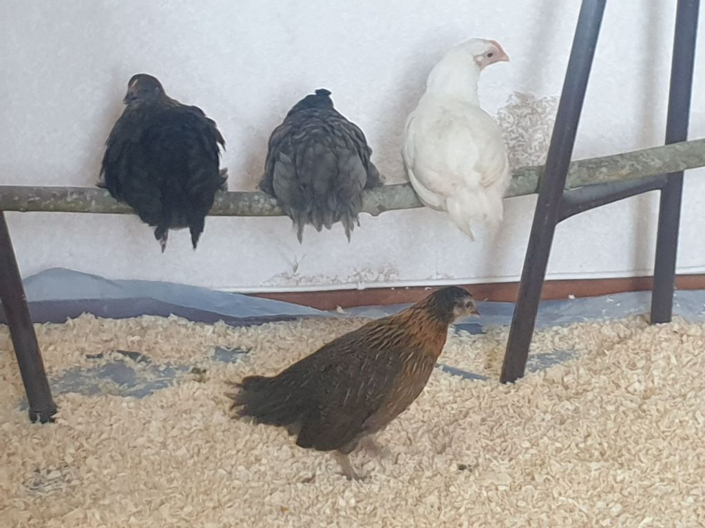 Efter bilfärd i en pappkartong fick de komma ut i sitt nya hem, hönshuset. Där fick de spendera sin första vecka i Kollanda. Eller nästan. För efter fyra-fem dagar instängda (med ett kompostgaller i dörröppningen så att de kunde titta ut dagtid) visade de tydligt att de verkligen ville ut. Någon gång hittade jag dem till och med utanför kompostgallret – men då var de inte så kaxiga och lät sig lätt fösas in i huset igen. Men en dag innan det planerande utsläppandet så fick de komma ut i det fria.