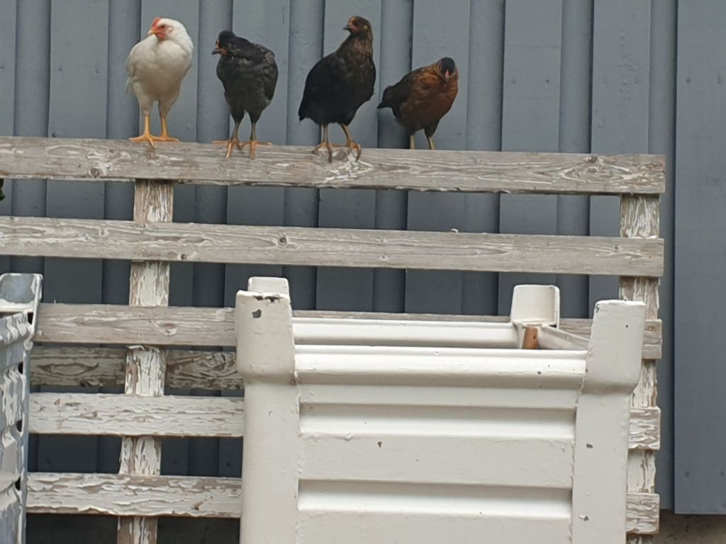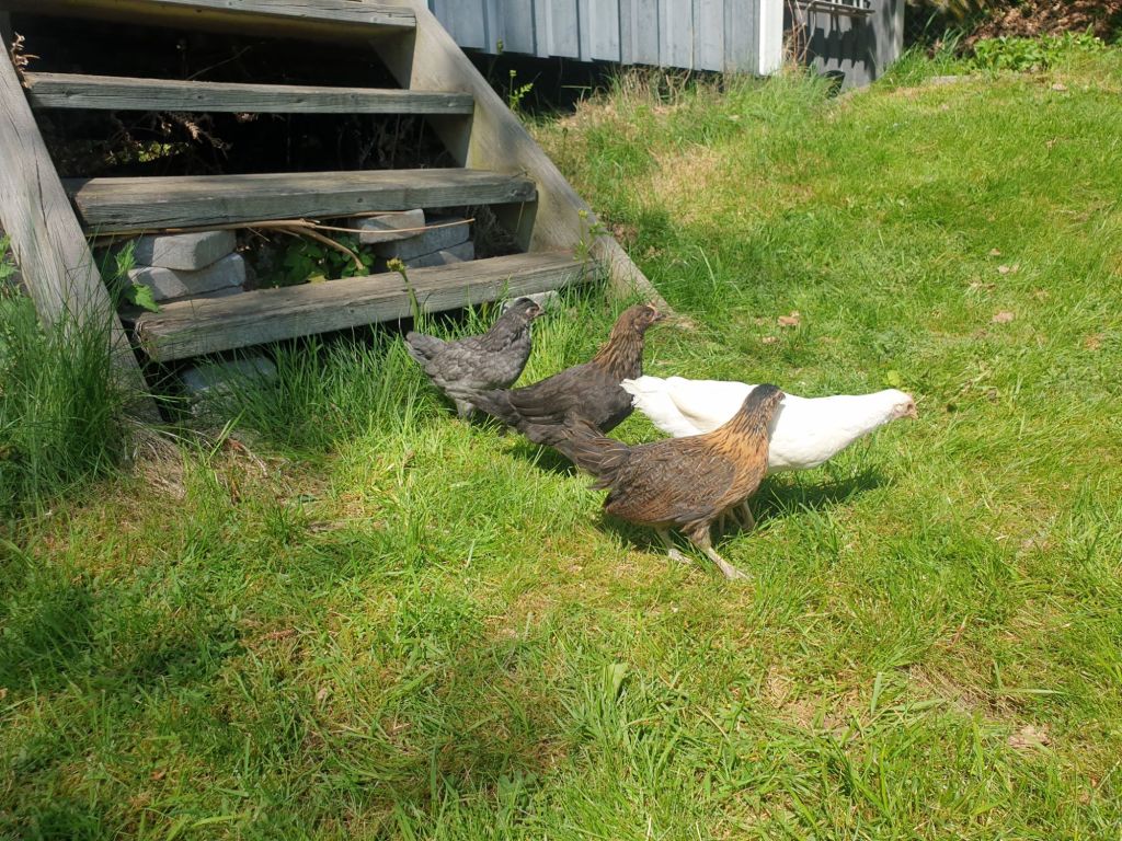 Nu har det gått några veckor sedan de flyttade hit, och jag trivs verkligen med att ha hönorna struttandes omkring här. De håller ihop, de fyra systrarna, och än hittar man dem under en buske, än på andra sidan staketet, än uppflugna på den stora lastpallen (som min säng levererades på för nio år sedan) som kommer väl till pass.