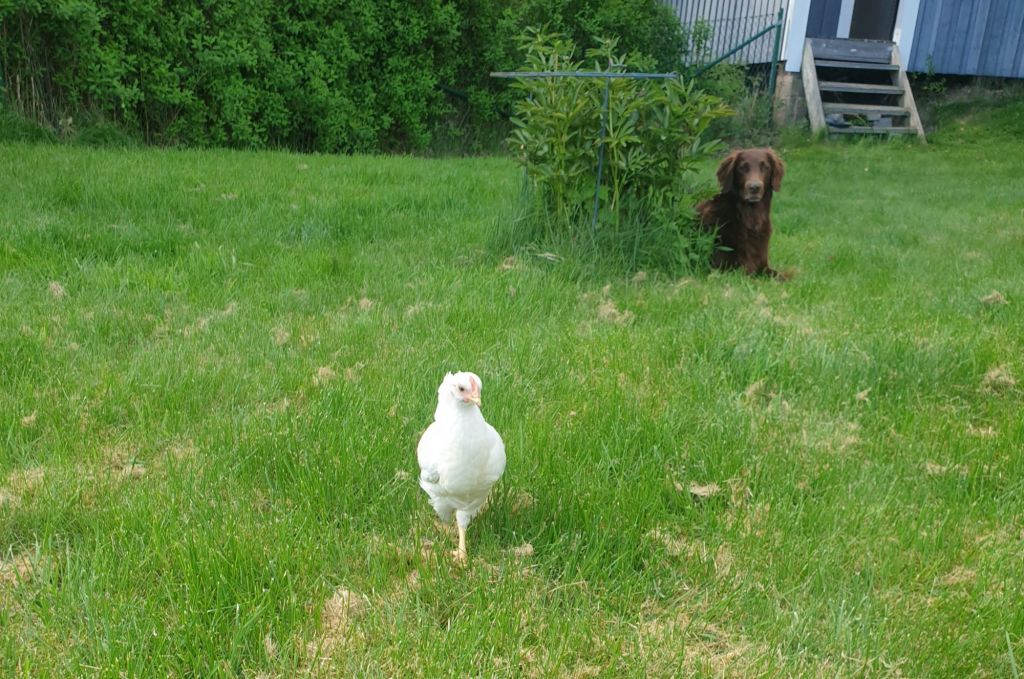 Och hur går det med hundarna och hönsen, då? Över förväntan! Jag undrade framför allt hur Delfi skulle klara av att umgås med hönsen – under den första veckan stod hon gärna på andra sidan kompostgallret och flåsade. Men upphetsningen över hönsen avtog, särskilt när de väl kom ut på gräsmattan. Femma är A-barn som vanligt. Nyfiken, men lugn och sansad. Visst händer det att hundarna vill ta sig en lite väl nära titt på hönsen (titta, inte apportera! 😄) och när de ibland börjar busa med varandra på gräsmattan gör hönorna såklart bäst i att hålla sig undan. Men annars är hönorna riktigt sällskapliga även med hundarna.