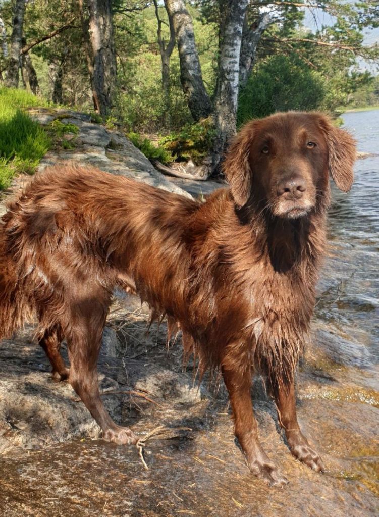 Studsar gör hon som vilken ung flatte som helst, och det tackar jag hennes nya kosttillskott för. Jag slutade med de svindyra tabletterna och började ge glukosamin-pulver istället. Så mycket bättre. Det märks att hon blivit mer aktiv – jag behöver inte ens hålla igen på maten längre, och hon är ändå i sitt livs form – fortfarande ingen ”snygg flatte”, men ta mig tusan den vackraste hund jag vet.